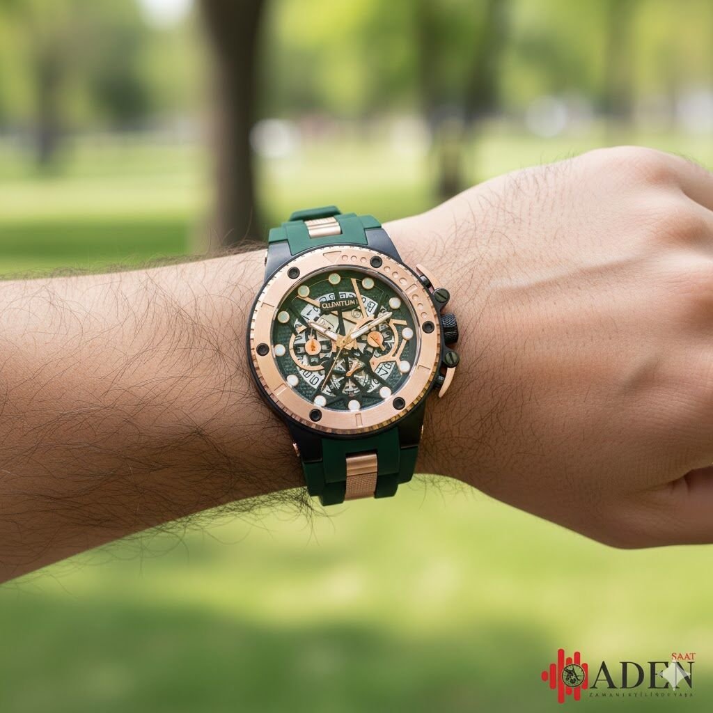 Quantum HNG535.857 Erkek Spor Saat – Rose Gold&Siyah Çelik Kasa – Koyu Yeşil Silikon Kordon – Kronograf