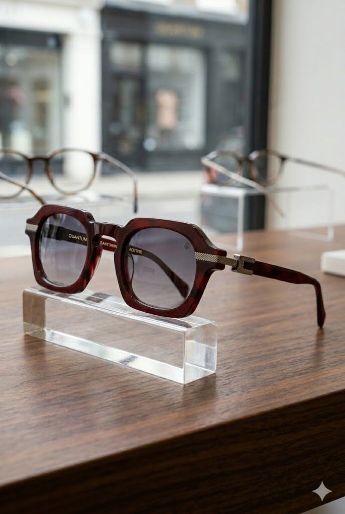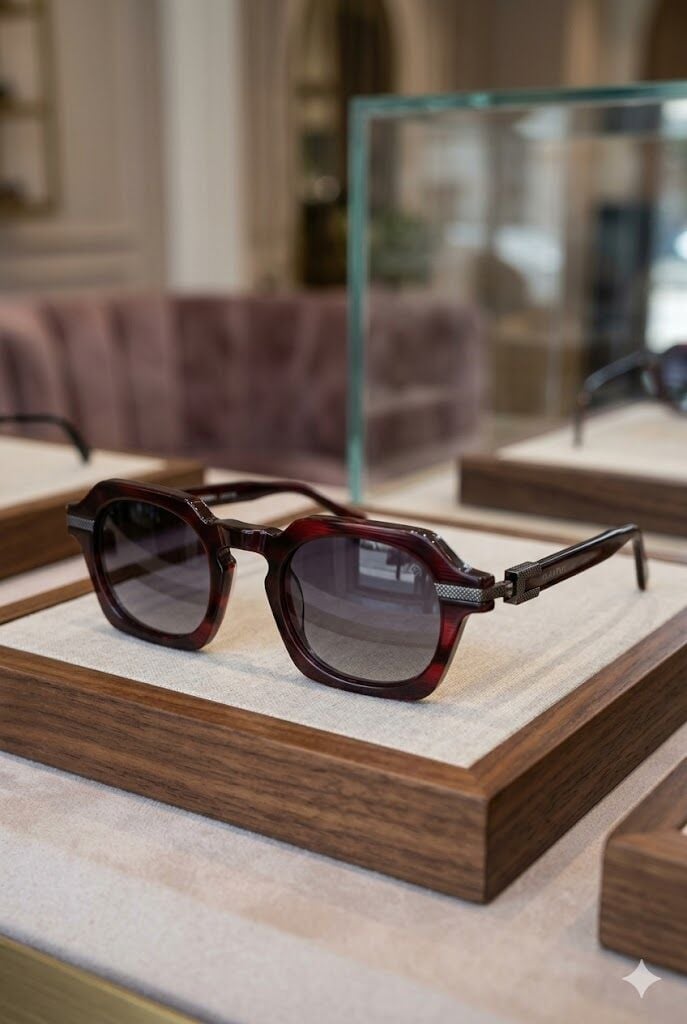 Kırmızı tonlu çerçeve ve geometrik form ile güçlü ve trend bir stil oluşturur.