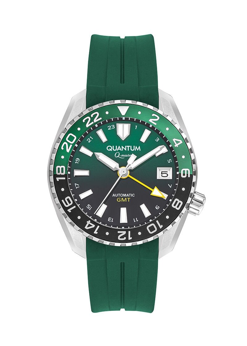 Quantum otomatik erkek kol saati, GMT fonksiyonu, safir cam koruması ve koyu yeşil silikon kordonu ile profesyonel saat tutkunları için tasarlanmış güçlü ve prestijli bir modeldir. Sportif tasarım ile ileri saat teknolojisini bir araya getirerek hem günlük kullanım hem de aktif yaşam için ideal bir deneyim sunar.