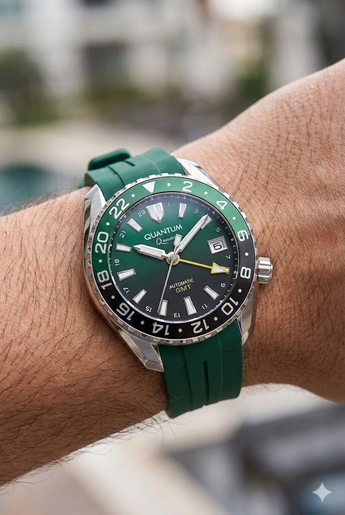 Quantum Otomatik GMT Erkek Kol Saati | 42mm, Safir Cam, Yeşil Silikon, 20ATM