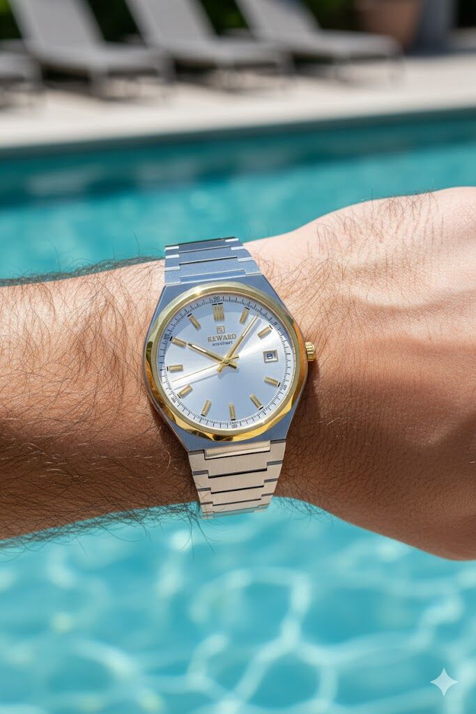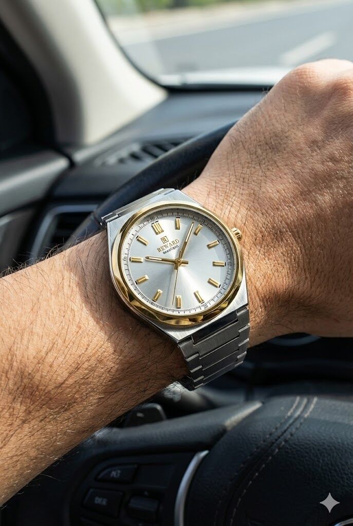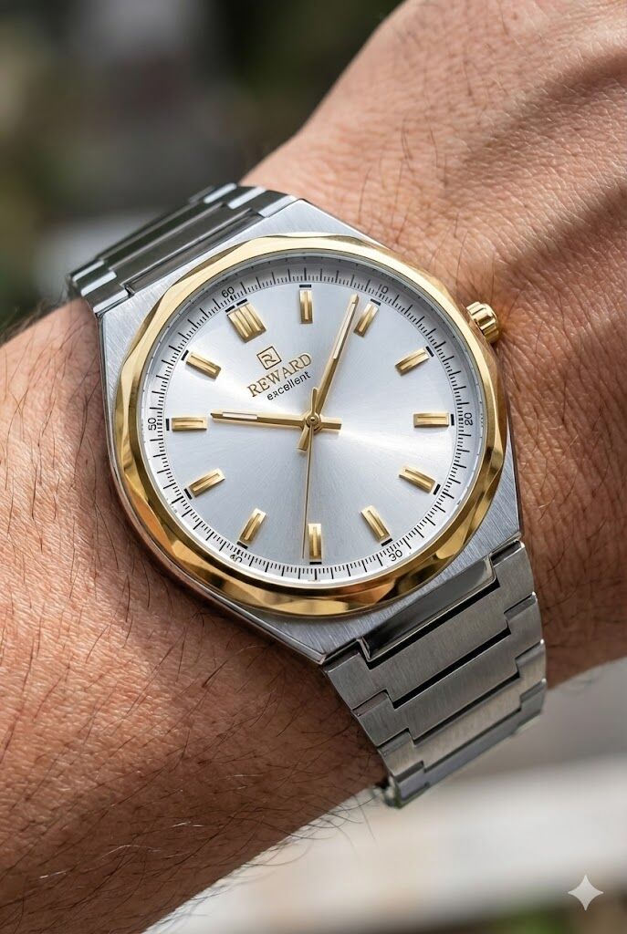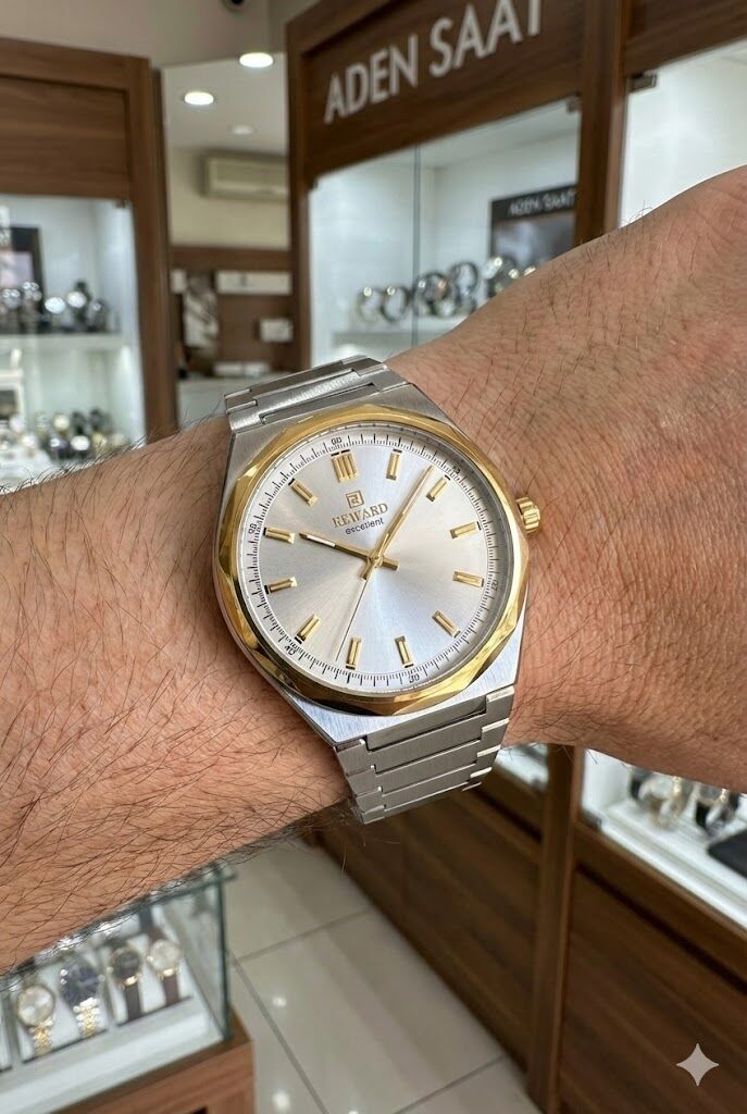 Reward erkek kol saati, gümüş kadranı ve altın detaylı çelik kasasıyla klasik şıklığı modern çizgilerle birleştirir. Çift renk çelik kordonu sayesinde hem spor hem klasik kombinlerle rahatlıkla kullanılabilir.