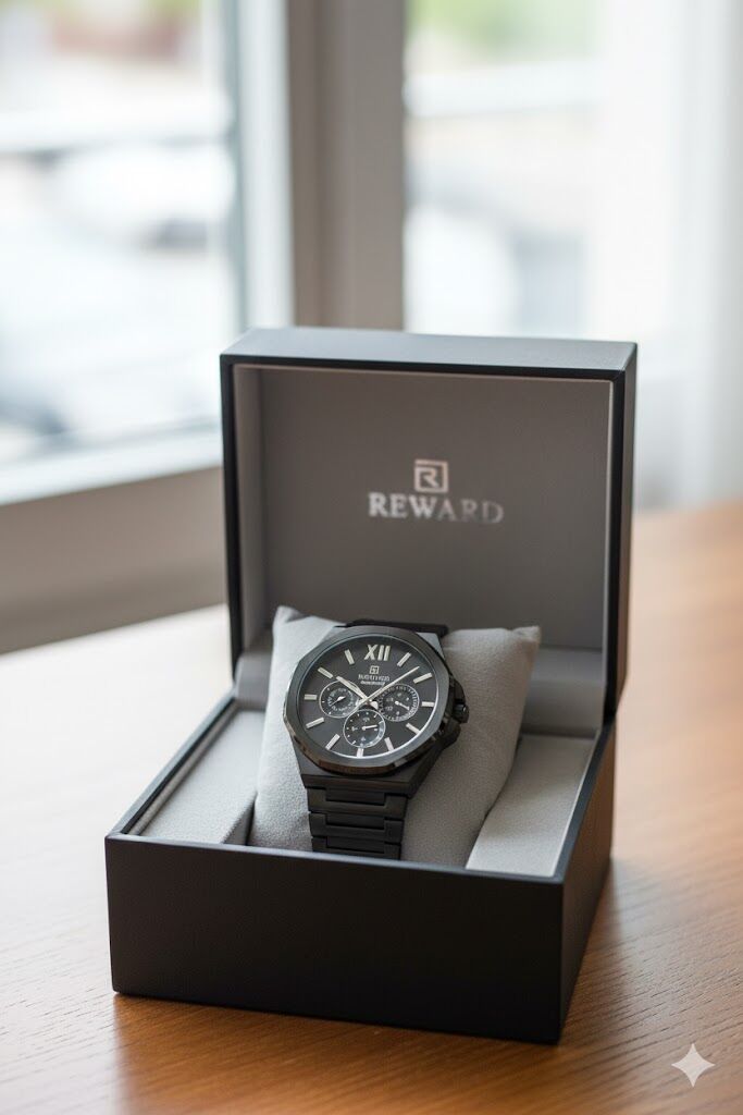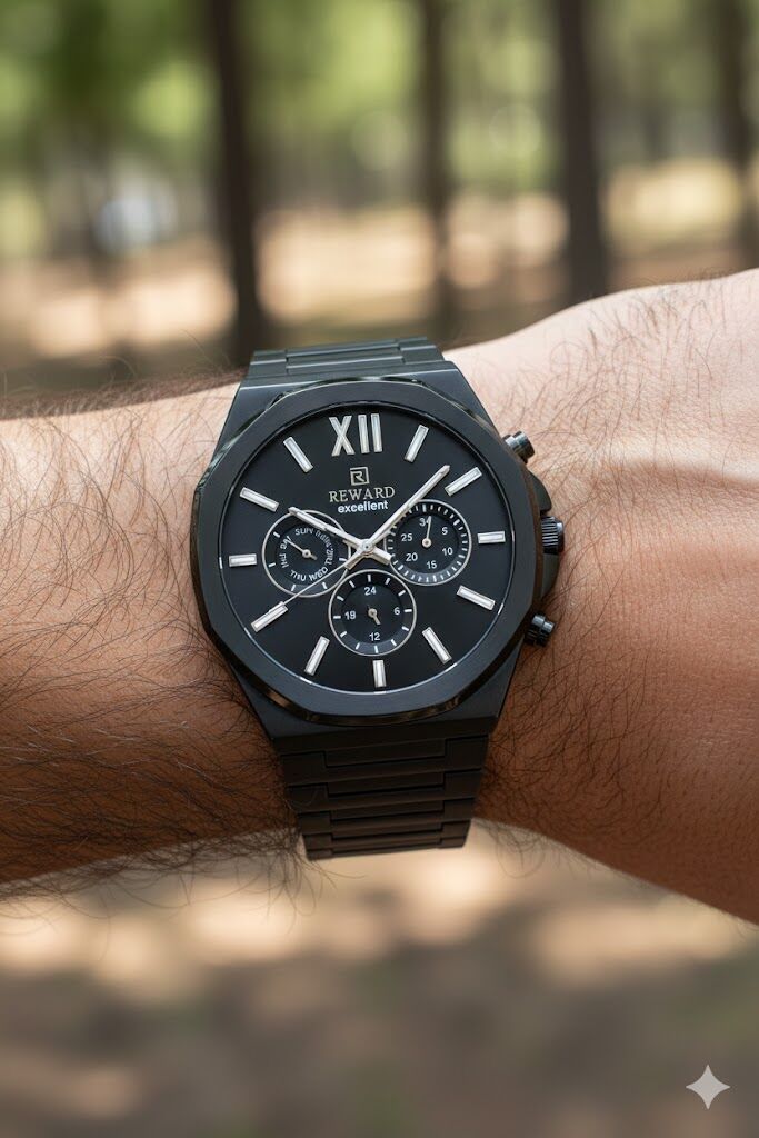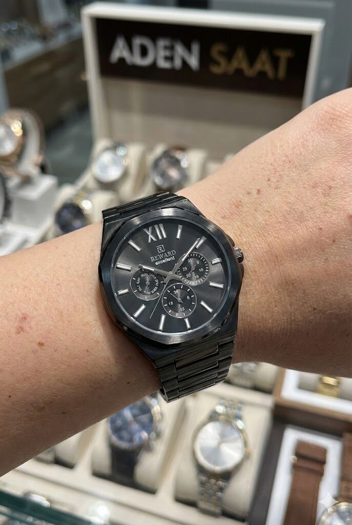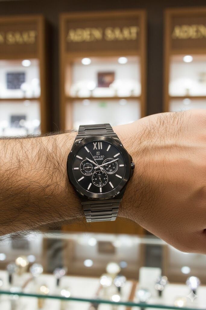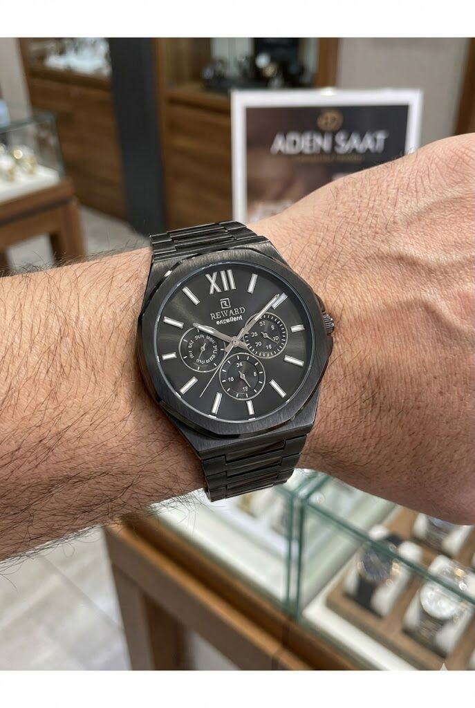 Reward erkek kol saati, siyah tonların hâkim olduğu güçlü tasarımı ve çok göstergeli kadran yapısıyla modern ve sportif bir stil sunar. Çelik kasa ve çelik kordon yapısı sayesinde günlük ve klasik kombinlerle rahatlıkla uyum sağlar.