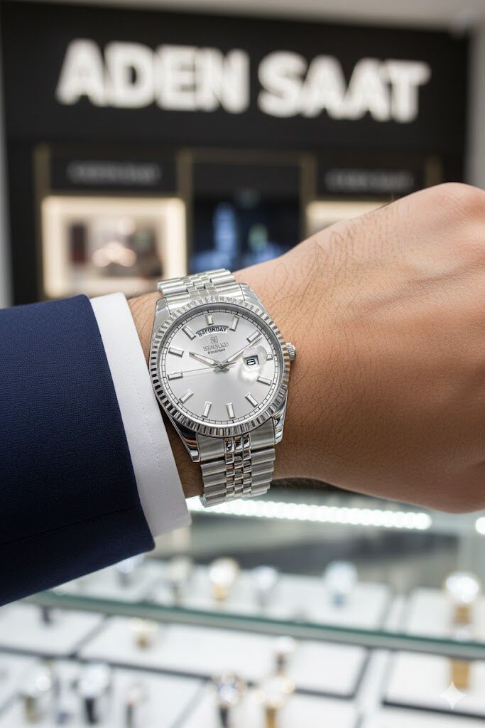 Paslanmaz çelik kasa ve çelik bilezik yapısı, hem sağlamlık hem de prestijli bir görünüm sunar. Kadrandaki net indeksler ve gün-takvim penceresi, saatin okunabilirliğini artırırken klasik saat severler için ideal bir stil oluşturur.