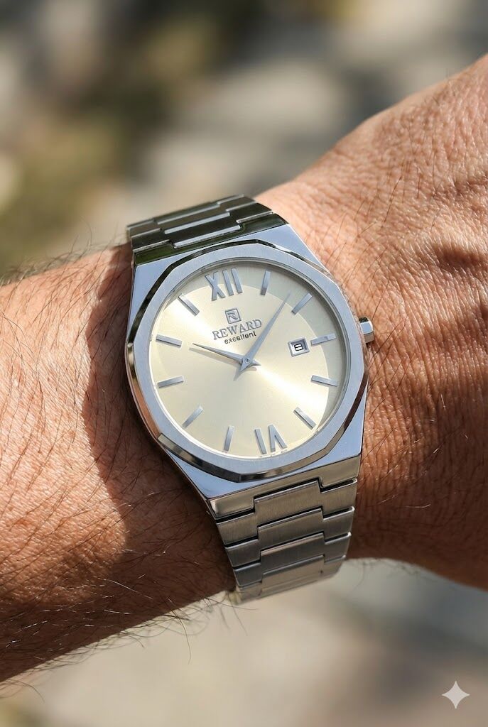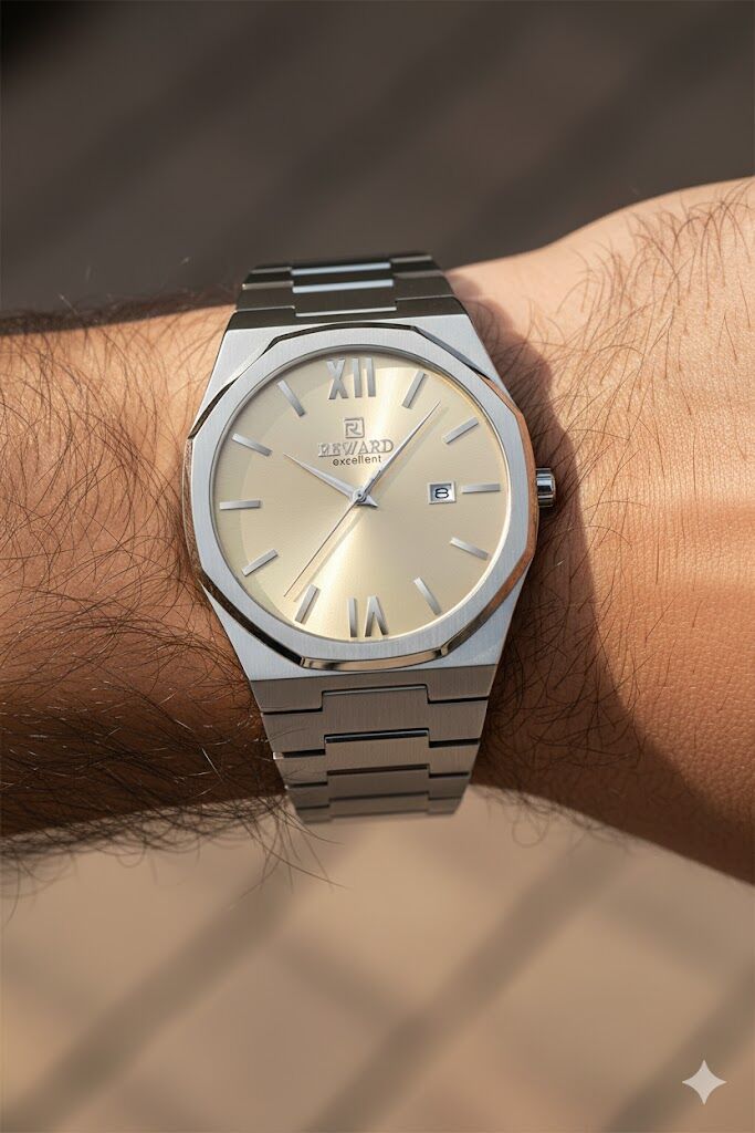 Reward Excellent A147342 erkek kol saati; gold tonlu kadranı ve modern köşeli kasa tasarımıyla şıklığı güçlü bir duruşla birleştirir. 42 mm kasa çapı sayesinde bilekte dengeli bir görünüm sunarken, paslanmaz çelik kasa ve çelik bilezik yapısı uzun ömürlü kullanım sağlar. Mineral cam yapısı günlük kullanıma uygun dayanıklılık sunar. 5 ATM su geçirmezlik seviyesi ile günlük su temaslarına karşı güvenle kullanılabilir.