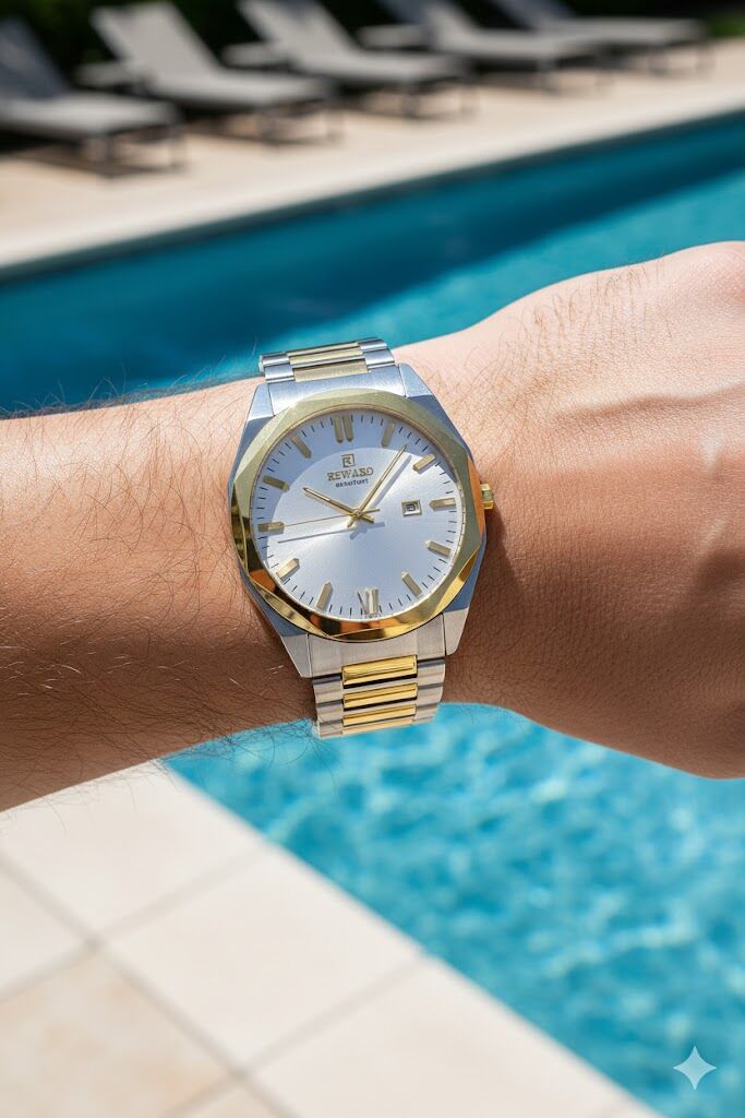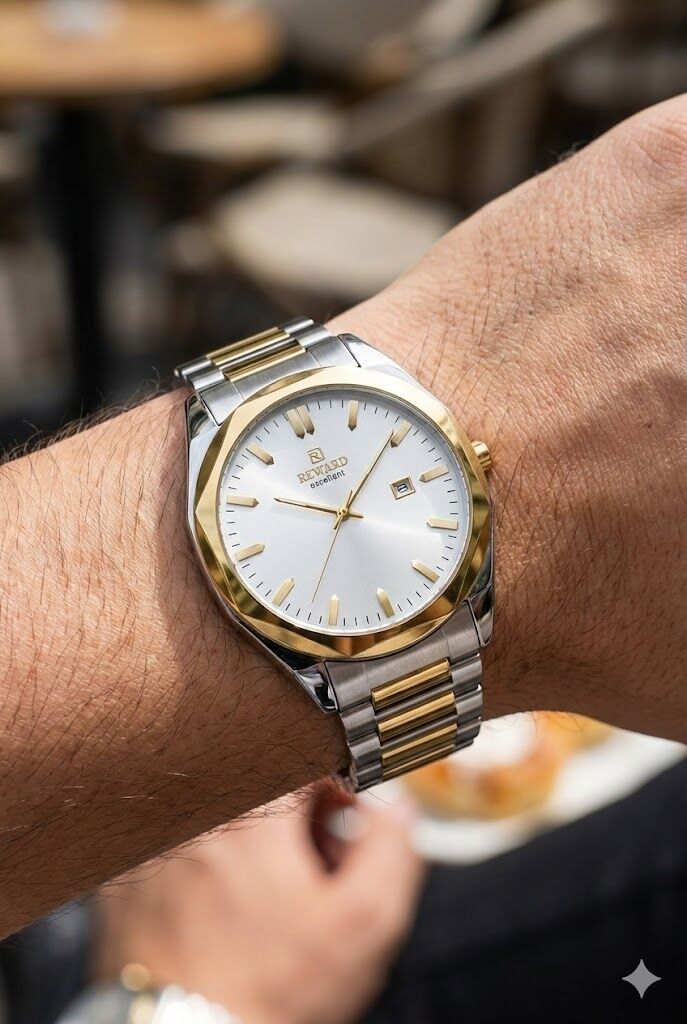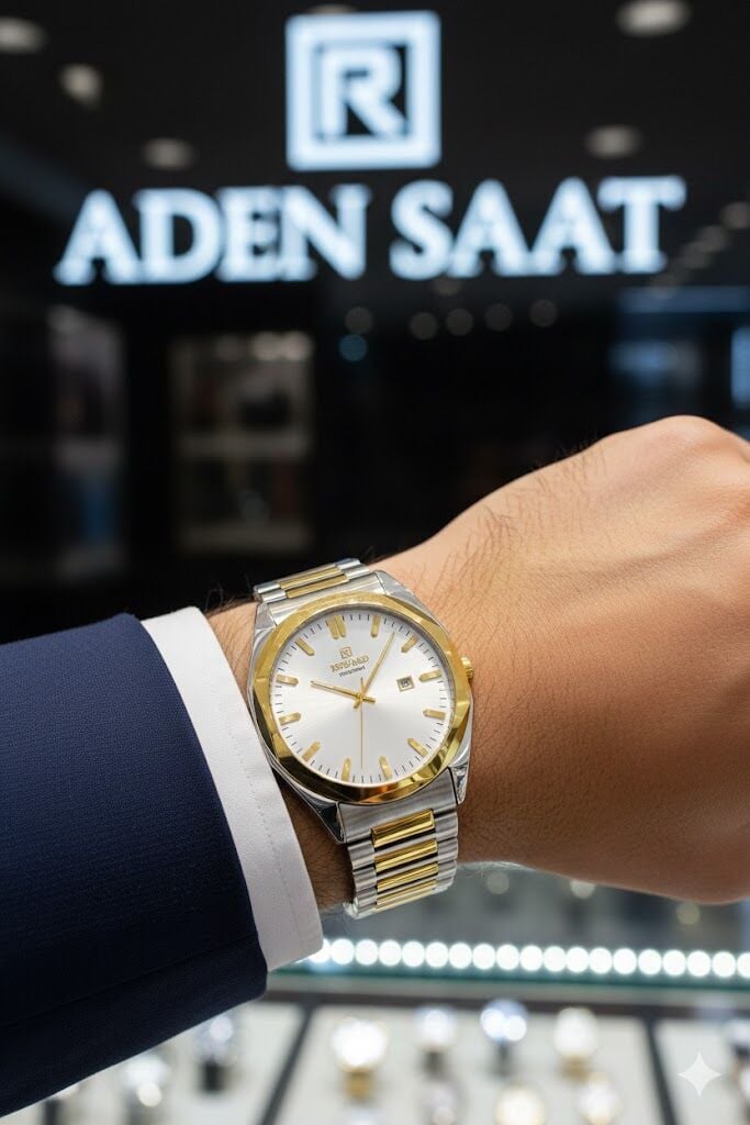 Paslanmaz çelik kasa ve çift renkli çelik bilezik, bilekte konforlu ve sağlam bir kullanım sunar. Altın renk detaylar saate klasik bir zarafet kazandırırken, modern kasa formu güçlü bir stil oluşturur.