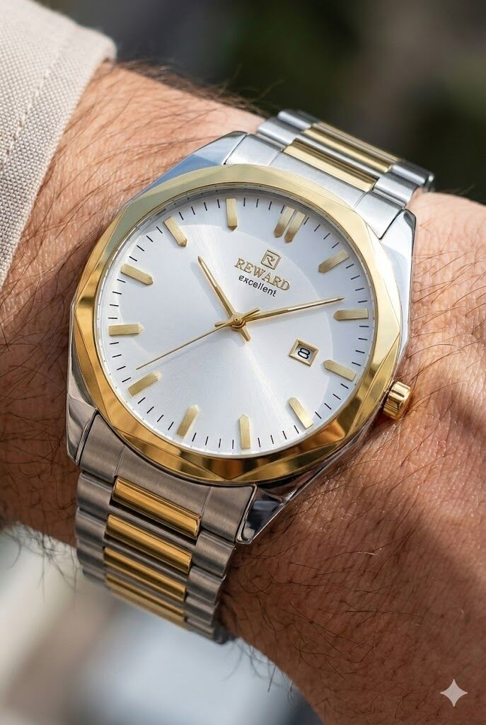 Reward Excellent Klasik Erkek Kol Saati | 42 mm Çelik Kasa, Altın & Gümüş Renk Çelik Kordon