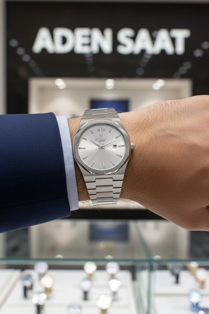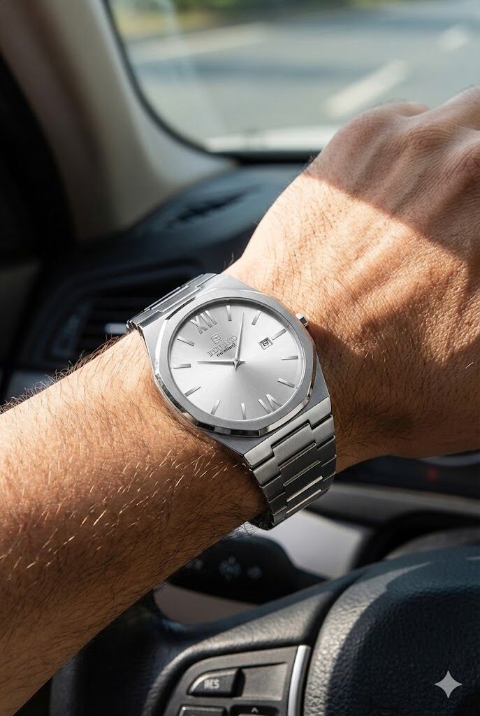 Paslanmaz çelik kasa ve çelik bilezik, bilekte sağlam ve konforlu bir kullanım sunar. Köşeli kasa formu, modern erkek stilini vurgulayan güçlü bir tasarım dili oluşturur.