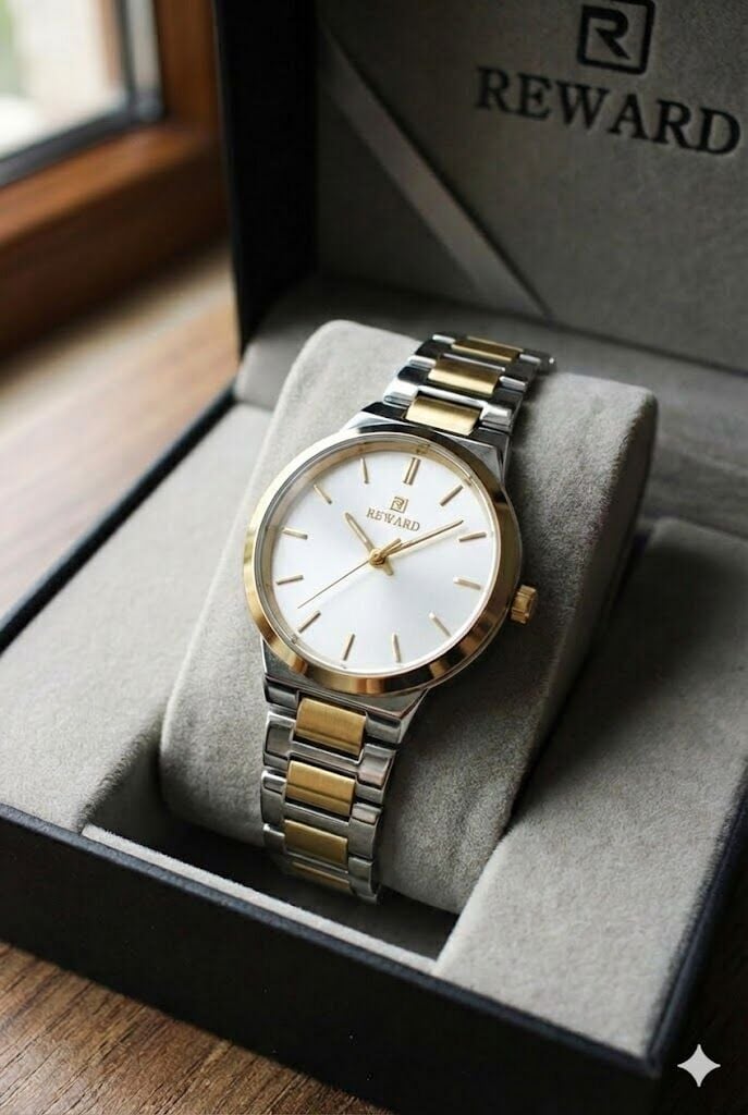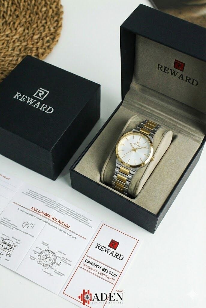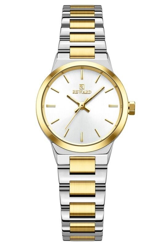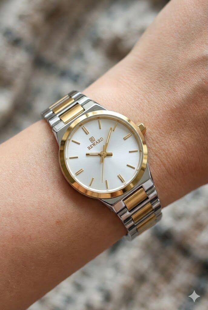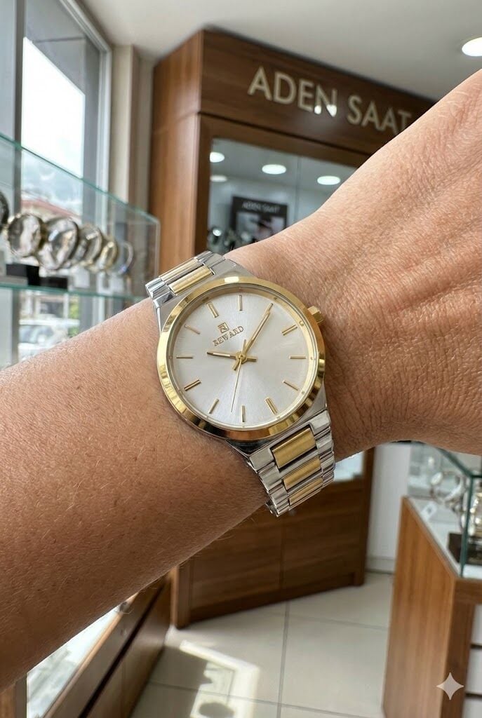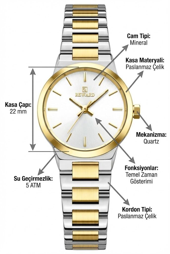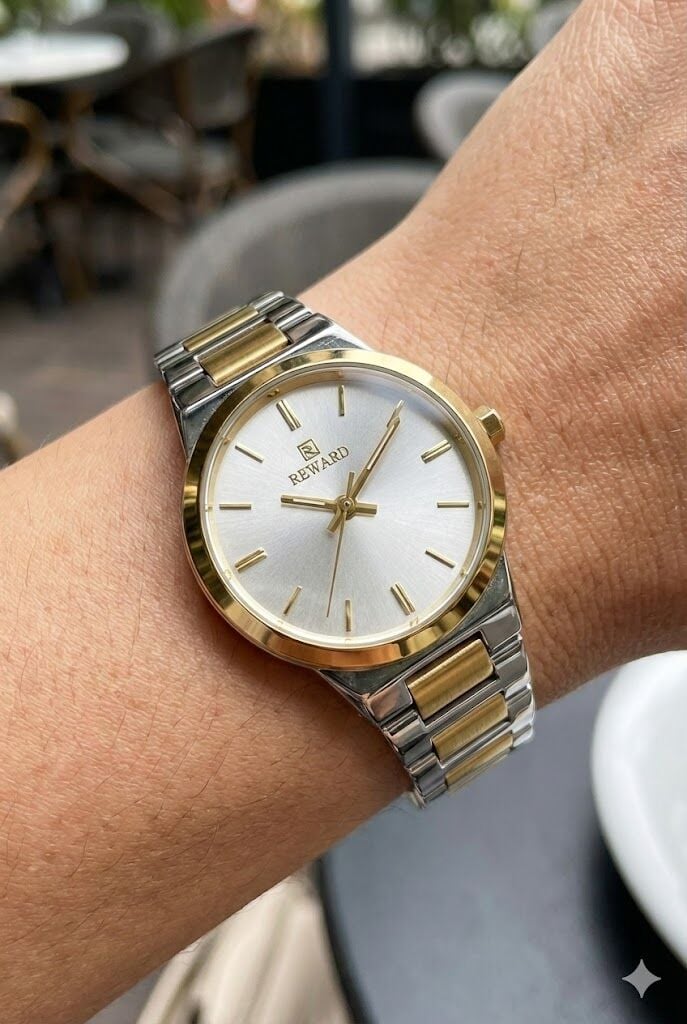 Reward kadın kol saati, sade kadran tasarımı ve çift renk çelik kasa-kordon yapısıyla zarif ve modern bir görünüm sunar. İnce kasa formu sayesinde bilekte hafif ve konforlu bir kullanım sağlar.