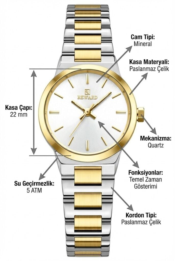 Reward Gümüş & Altın Renk Kadın Kol Saati | 22 mm Çelik Kasa, Çift Renk Çelik Kordon, Şık Tasarım