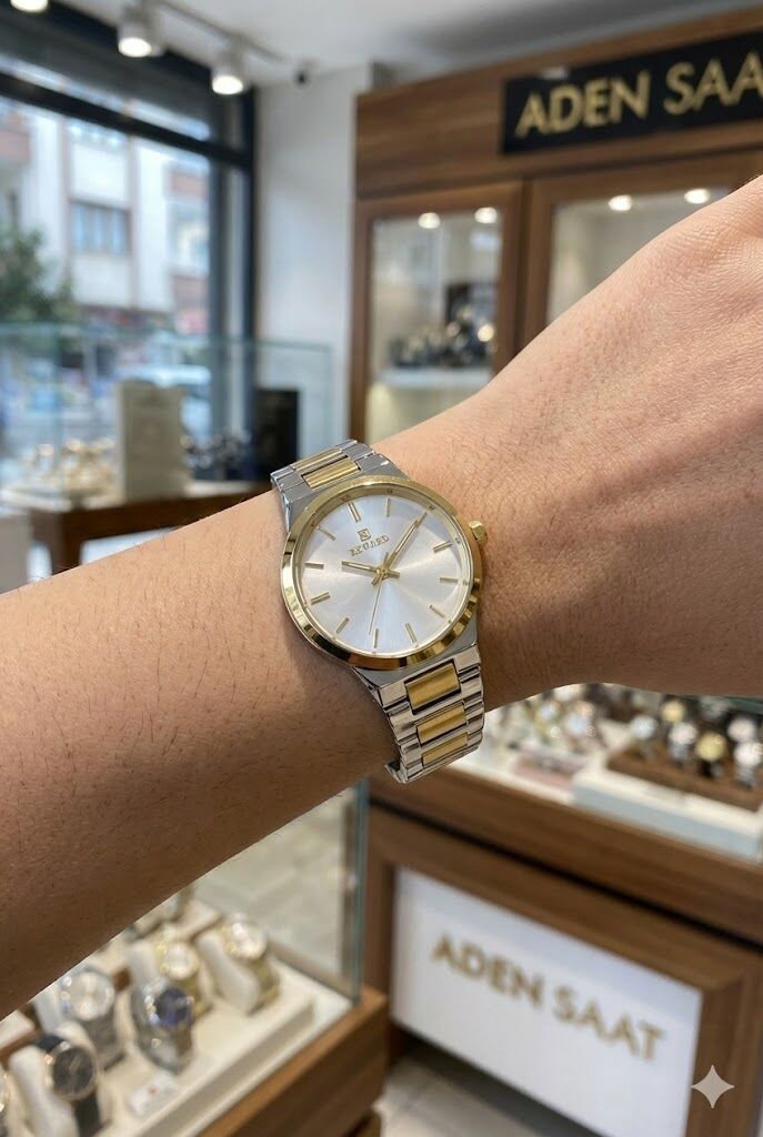 Gümüş ve altın tonlarının birlikte kullanıldığı çelik kordon, bilekte dengeli ve konforlu bir kullanım sunar. Günlük ve klasik kombinlerle uyumlu şekilde kullanılabilir.