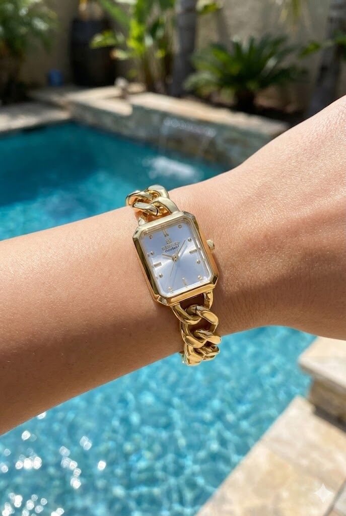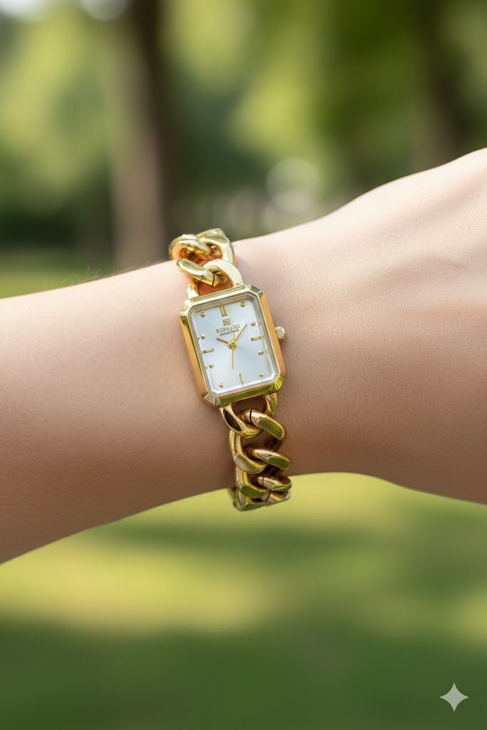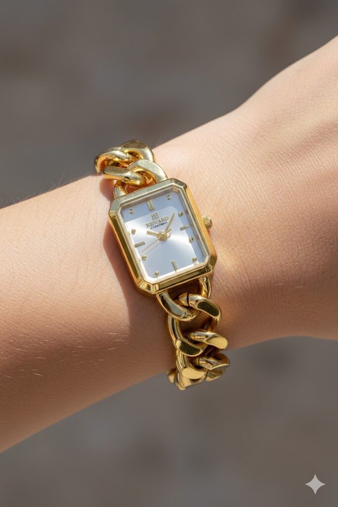 Reward kadın kol saati, zincir formundaki özgün kordon tasarımı ve altın tonlu şık görünümüyle dikkat çeken özel bir modeldir. Dikdörtgen kasa yapısı ve sade kadran tasarımı, bilekte zarif ve modern bir duruş sunar. Günlük kullanımda ve özel kombinlerde stilinizi tamamlayan estetik bir aksesuardır.