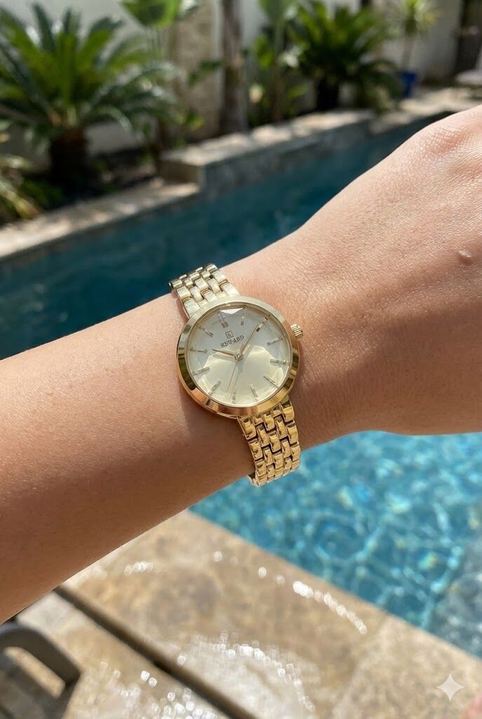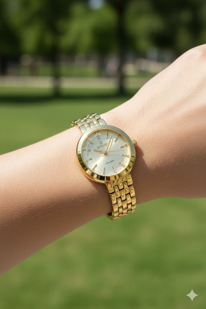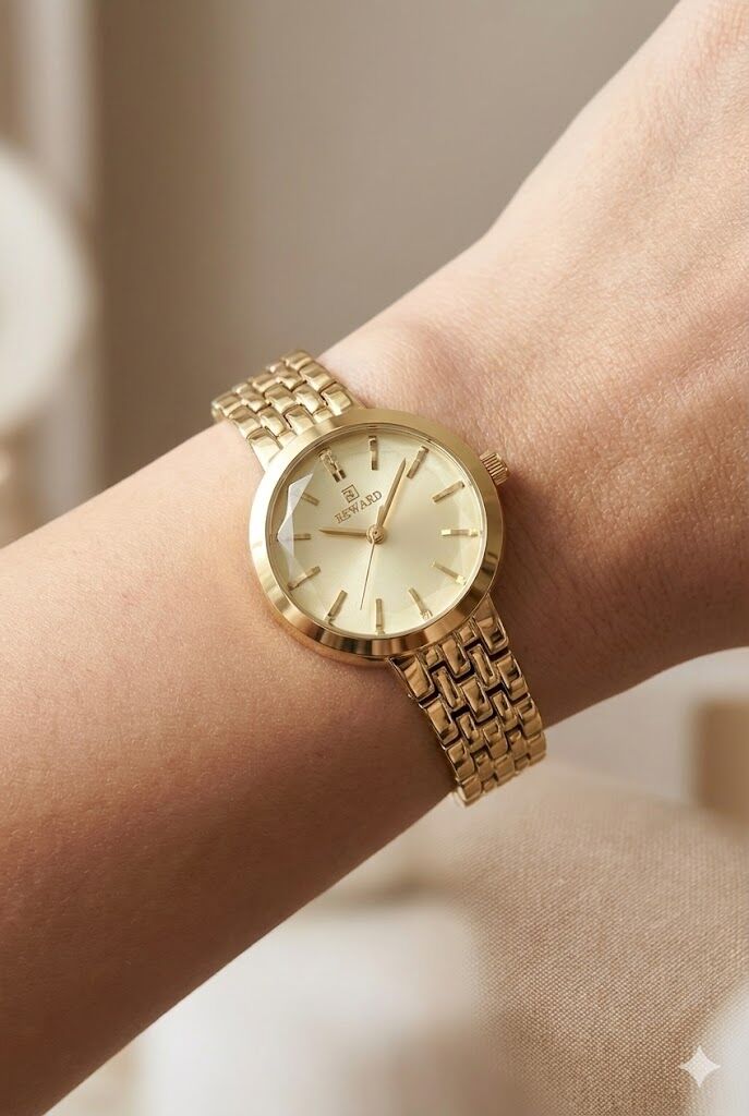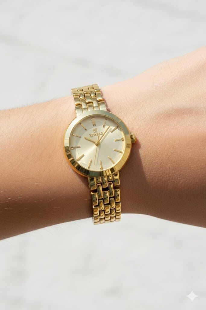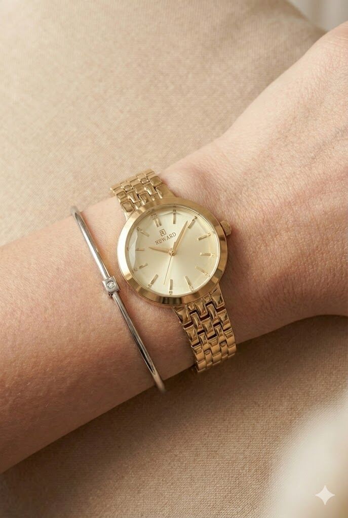 Reward kadın kol saati, altın tonlu sade kadranı ve uyumlu çelik kordon tasarımıyla zamansız bir şıklık sunar. Minimal detayları ve yuvarlak kasa formu sayesinde hem günlük kullanımda hem de özel anlarda zarif bir tamamlayıcı olarak öne çıkar.