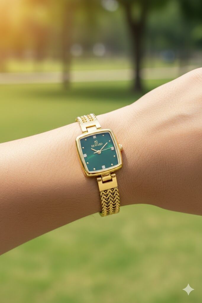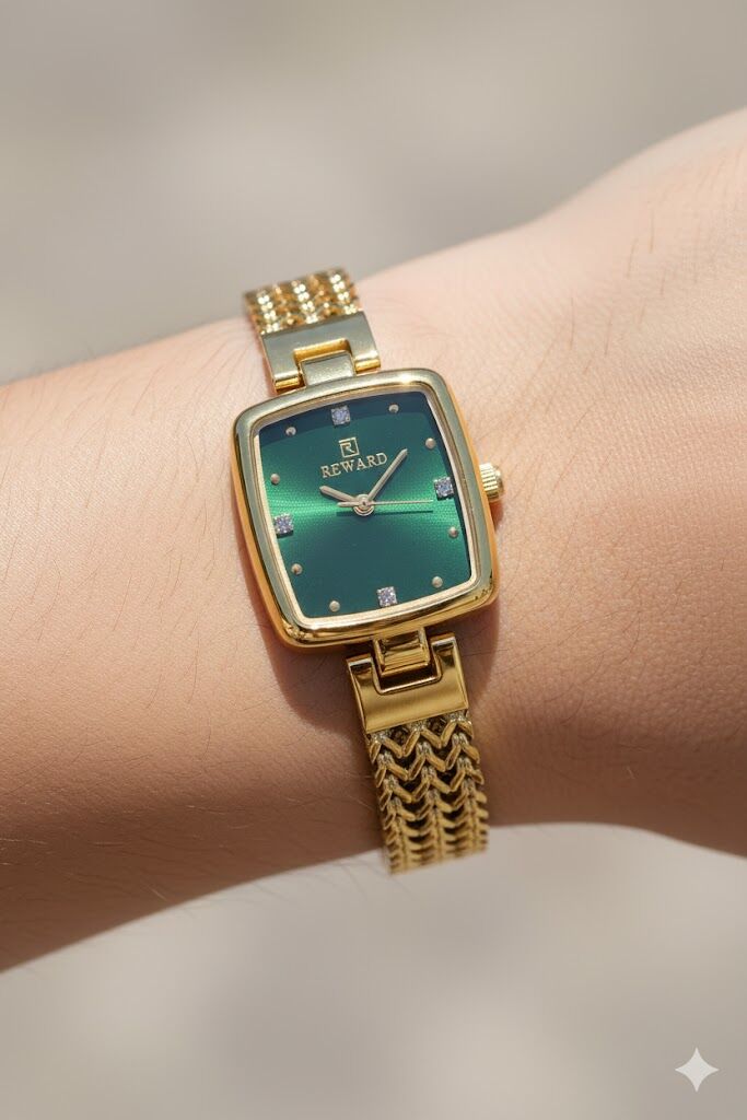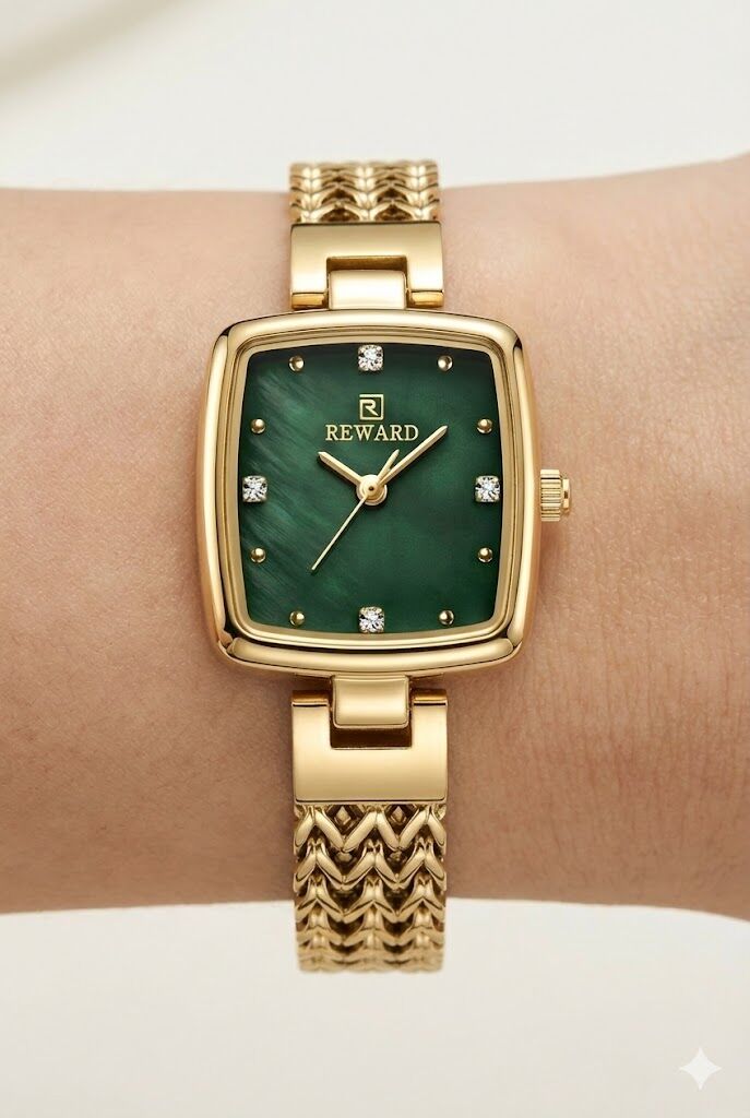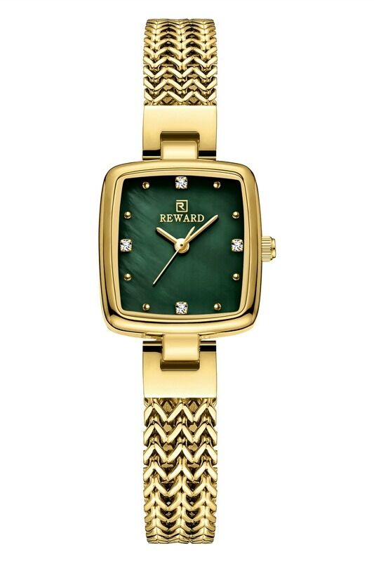 Reward kadın kol saati, yeşil tonlu kadranı ve altın renkli çelik zincir formundaki kordonuyla dikkat çeken zarif bir tasarım sunar. Kare kasa yapısı ve taş detaylı indeksleri sayesinde feminen, modern ve şık bir duruş sergiler. Günlük kombinlerden özel davetlere kadar stilinizi tamamlayan estetik bir aksesuardır.
