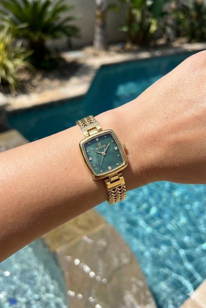 Kare kasa formu ve yeşil kadranın sofistike görünümü, saate özgün ve zarif bir karakter kazandırır. Taş detaylı indeksler, bilekte şık ve dikkat çekici bir görünüm sunar.
