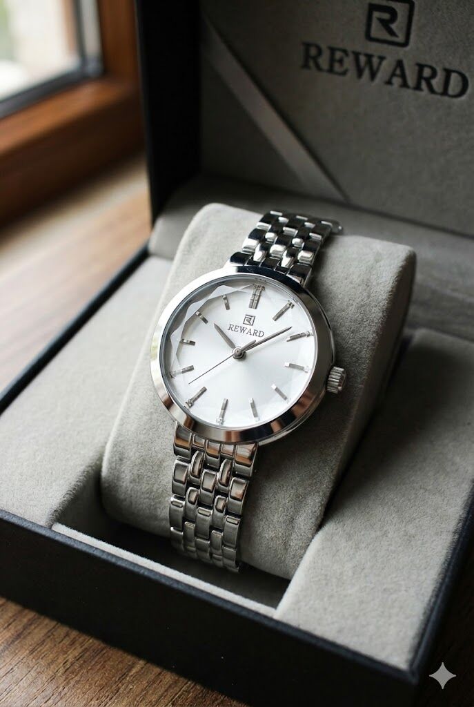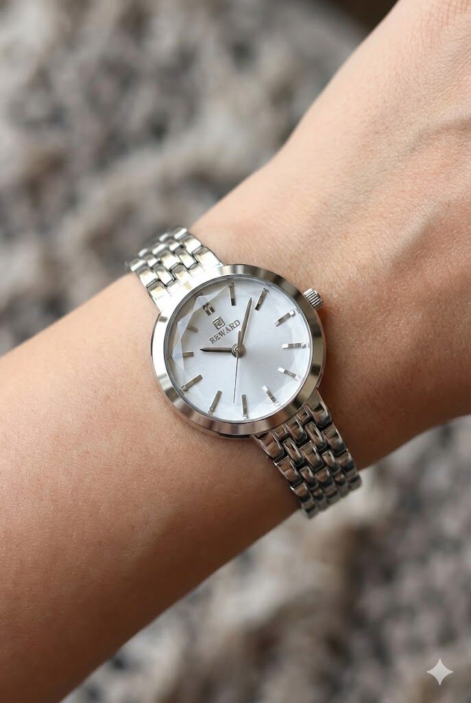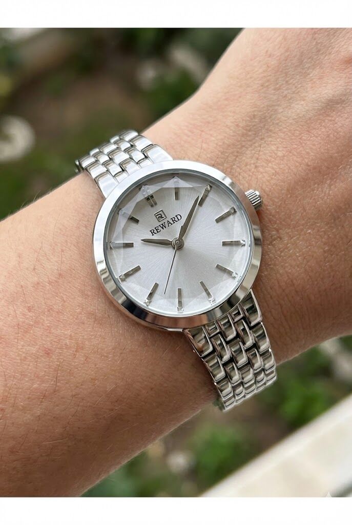Reward kadın kol saati, zarif kasa yapısı ve ince çelik kordonu ile sade ve şık bir görünüm sunar. Gümüş tonlu kadranı ve minimal indeks tasarımı sayesinde günlük kullanımda ve klasik kombinlerde rahatlıkla tercih edilebilir.