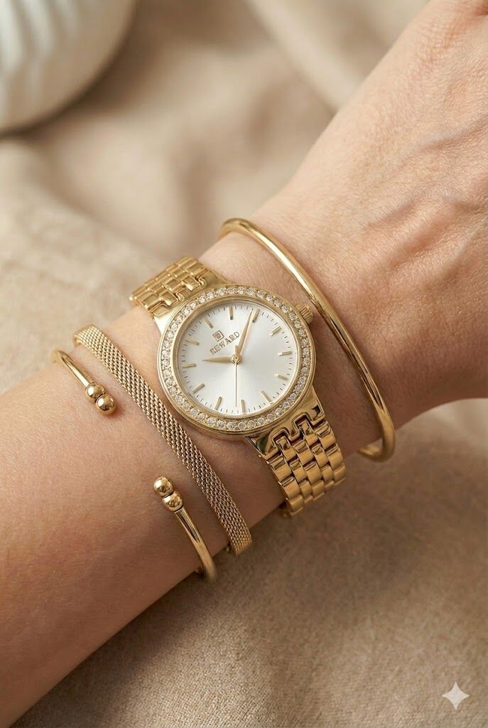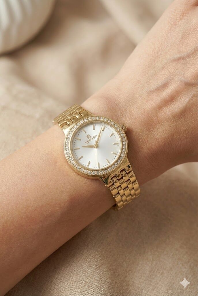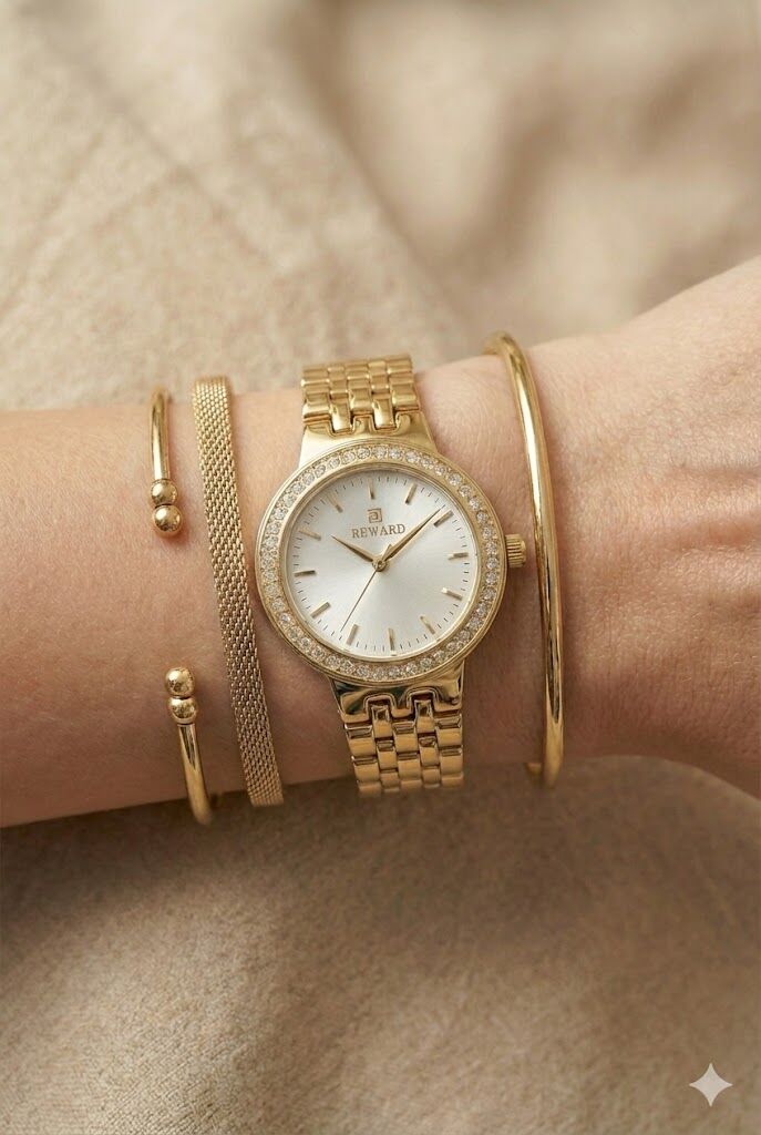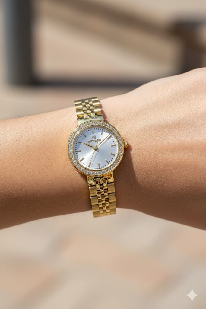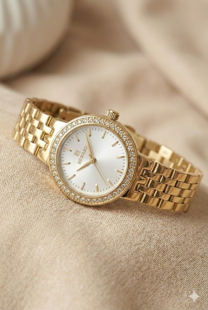 Reward kadın kol saati, zarif taşlı bezel detayı ve altın renkli çelik kordonu ile klasik şıklığı modern bir yorumla sunar. İnce kasa yapısı ve sade kadran tasarımı sayesinde günlük kullanımdan özel davetlere kadar her ortamda şık bir tamamlayıcıdır.
