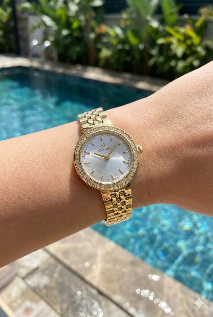 Taşlı bezel çevresi saate zarif bir ışıltı katarken, sade indeksli kadran tasarımı modern ve dengeli bir görünüm sunar. İnce detaylarıyla feminen bir duruş sergiler.