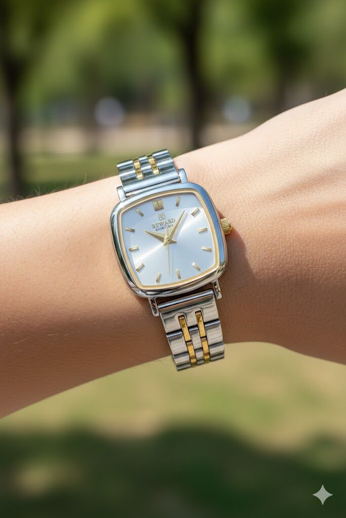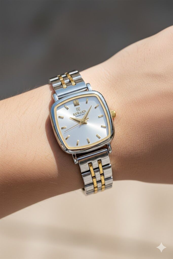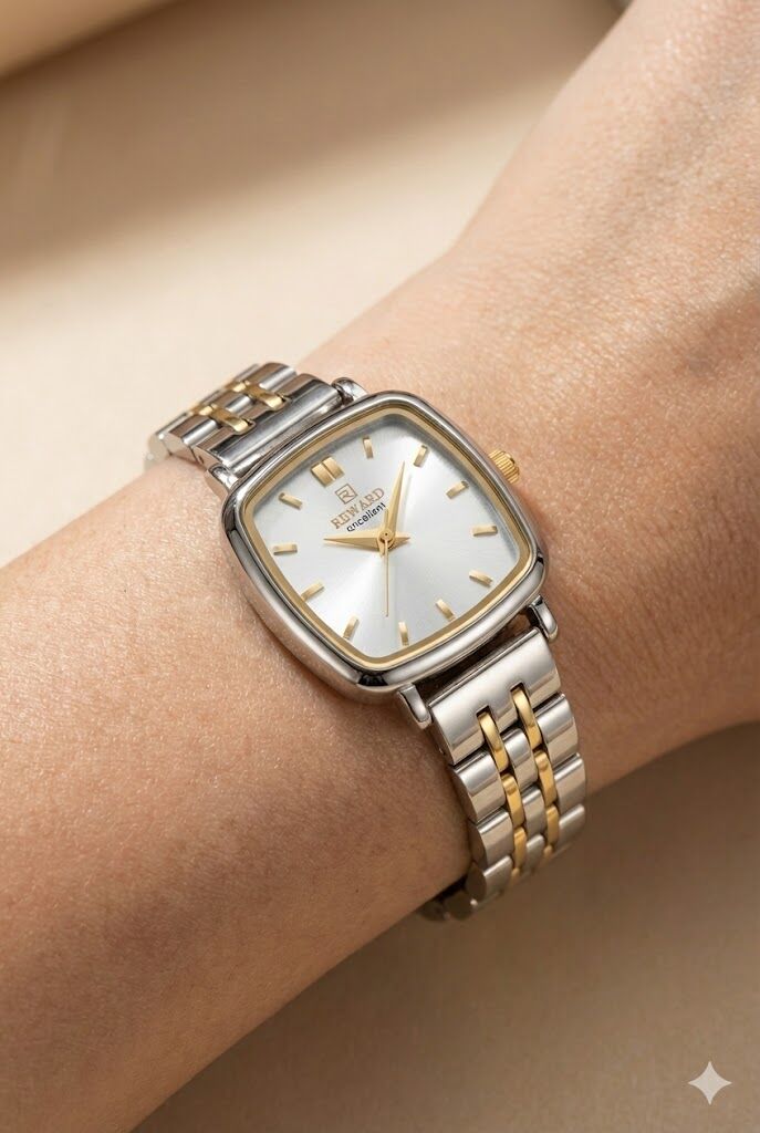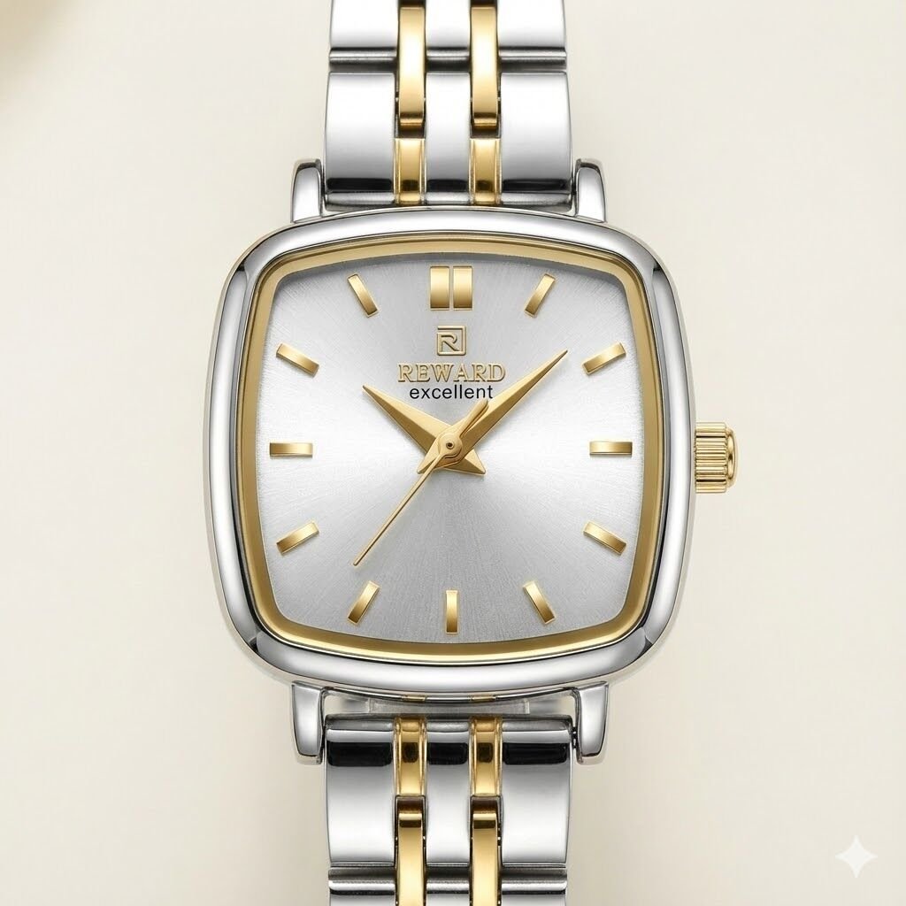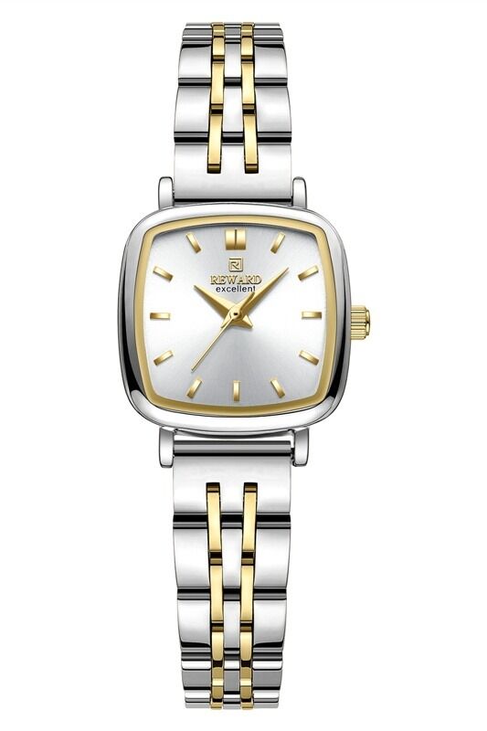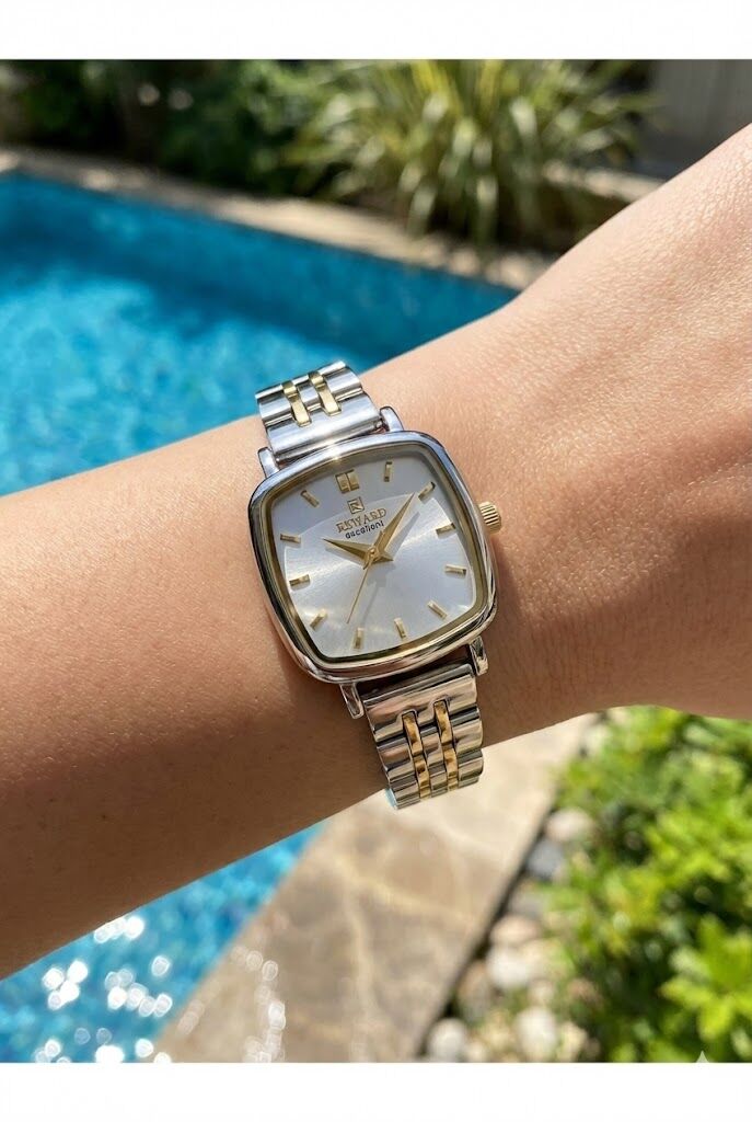 Reward kadın kol saati, iki renkli çelik kordonu ve zarif kare kasa formu ile klasik şıklığı modern detaylarla birleştirir. Gümüş tonlu kadran üzerinde yer alan altın renk indeksler ve akrep-yelkovan tasarımı, saatin sofistike görünümünü tamamlar.