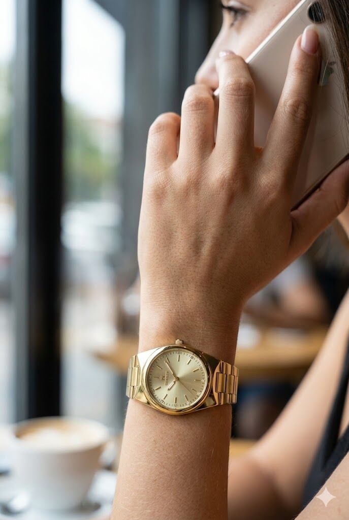 Altın renkli çelik kordon, bilekte dengeli ve konforlu bir kullanım sunar. Günlük ve klasik kombinlerle uyumlu şekilde kullanılabilir.