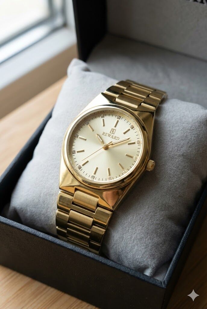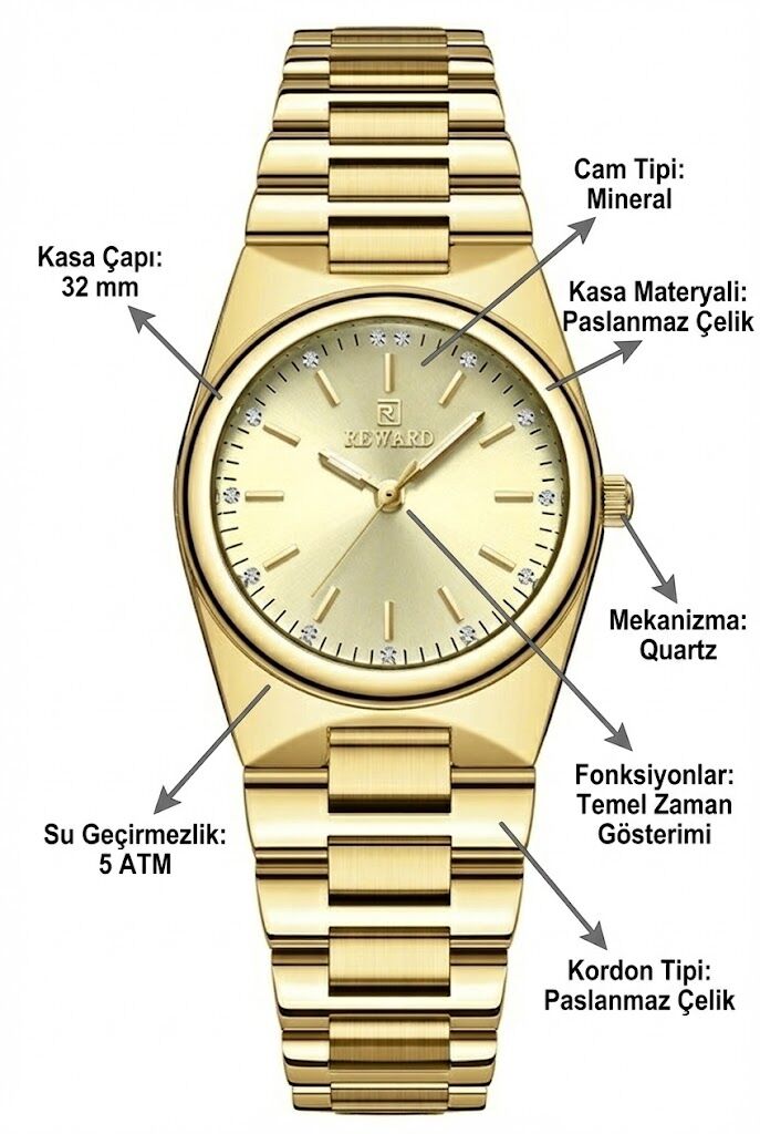 Reward kadın kol saati, altın tonlu kadranı ve taş detaylı indeksleriyle zarif ve klasik bir görünüm sunar. Altın renk çelik kasası ve uyumlu çelik kordonu ile günlük ve şık kombinlerle uyum sağlar.