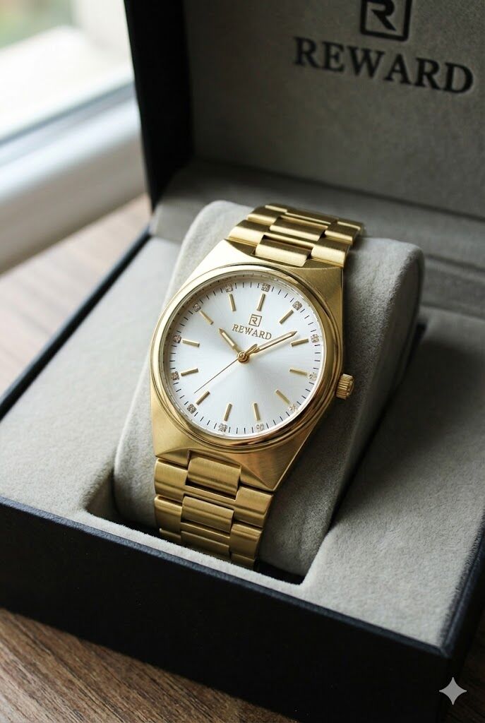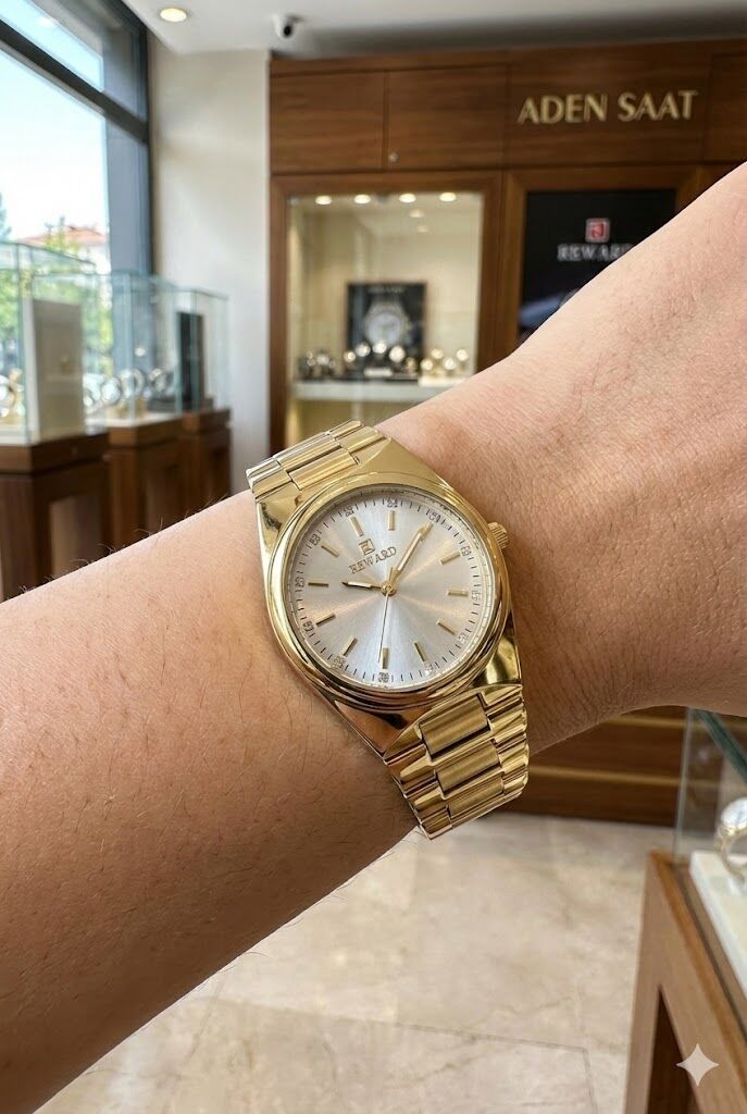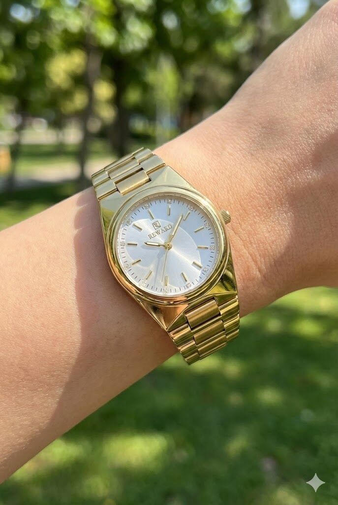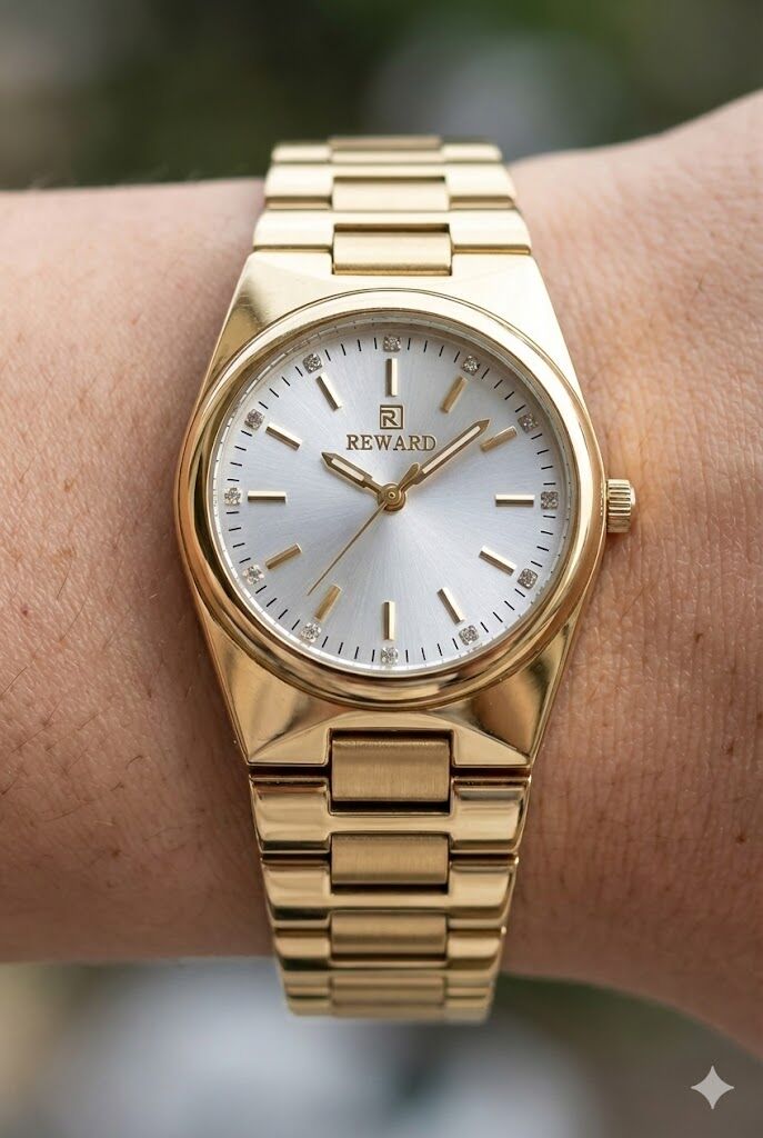 Reward kadın kol saati, gümüş kadranı ve taş detaylı indeksleriyle zarif ve klasik bir görünüm sunar. Altın renk çelik kasası ve uyumlu çelik kordonu ile günlük ve özel kombinlerde şıklığı tamamlar.