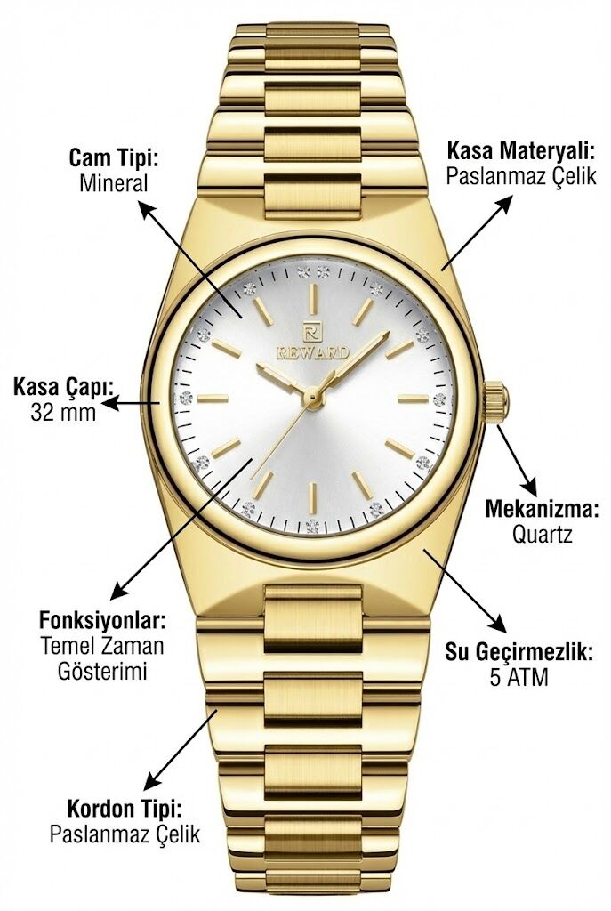 Reward Kadın Kol Saati | 32 mm Çelik Kasa, Altın Renk Çelik Kordon, Mineral Cam, 5ATM