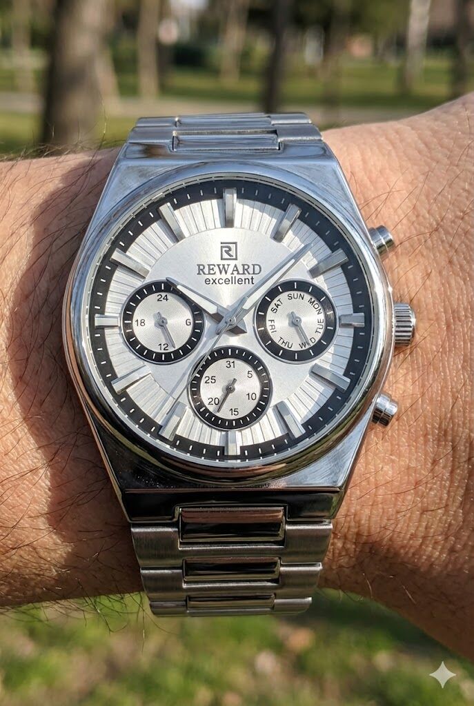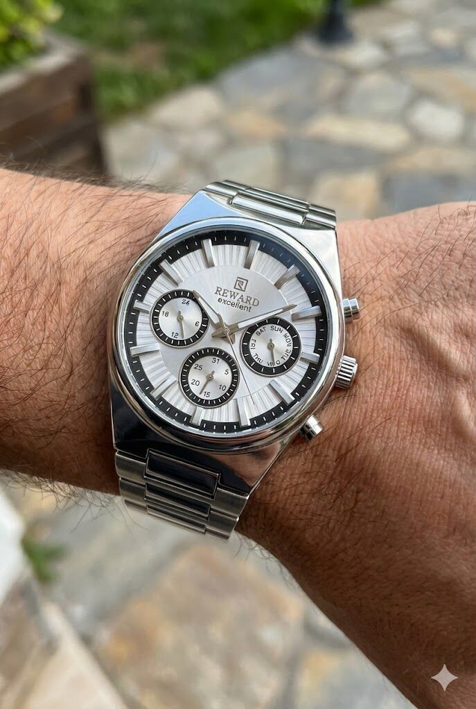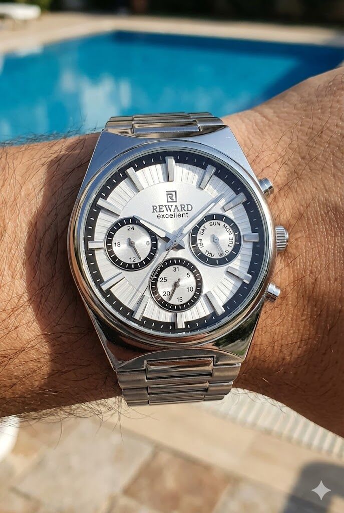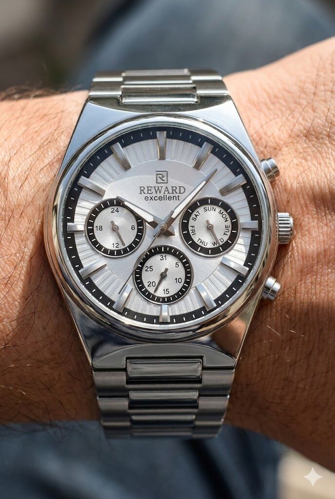 Reward erkek kol saati, büyük kasa yapısı ve çok göstergeli kadranı ile güçlü ve sportif bir stil sunar. Gümüş tonlu kadranı ve çelik kasa-kordon yapısı sayesinde hem günlük hem de klasik kombinlerle uyum sağlar.