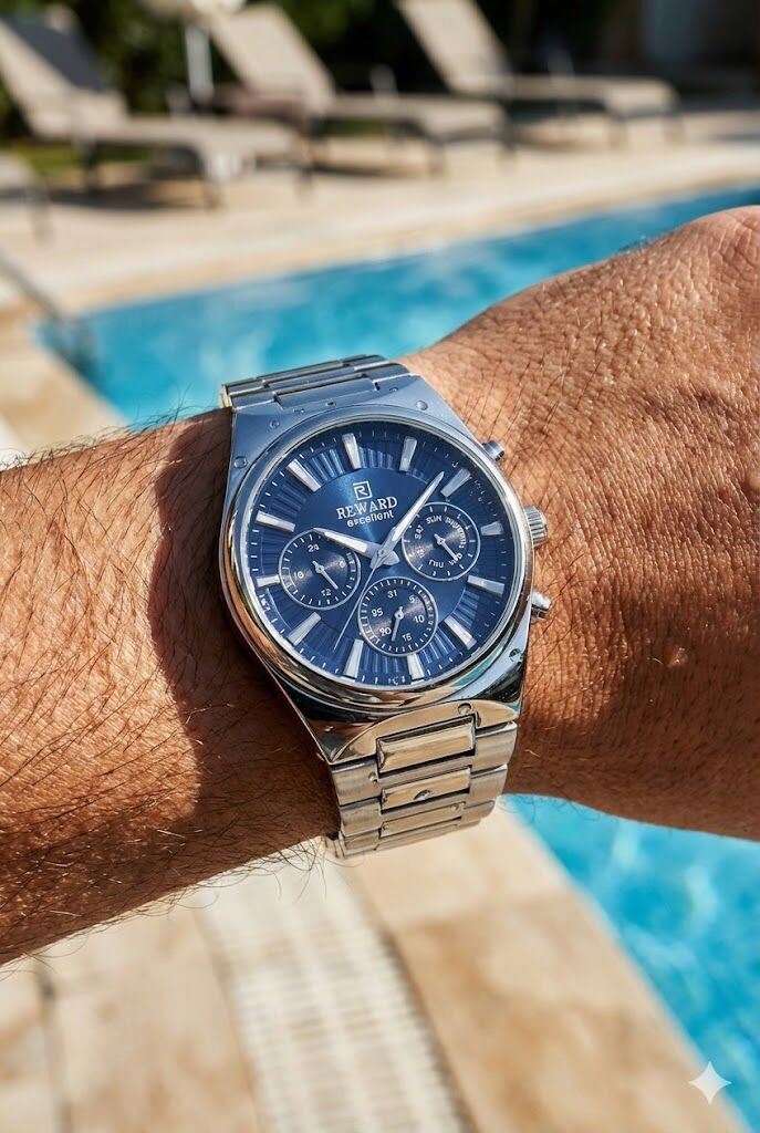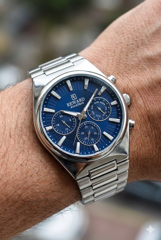 Reward erkek kol saati, lacivert tonlu çok göstergeli kadranı ve çelik kasa-kordon yapısıyla sportif ve modern bir stil sunar. Dinamik kadran tasarımı, hem günlük kullanımda hem de klasik kombinlerde uyum sağlar.