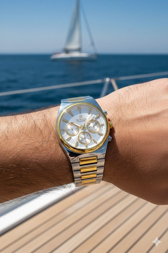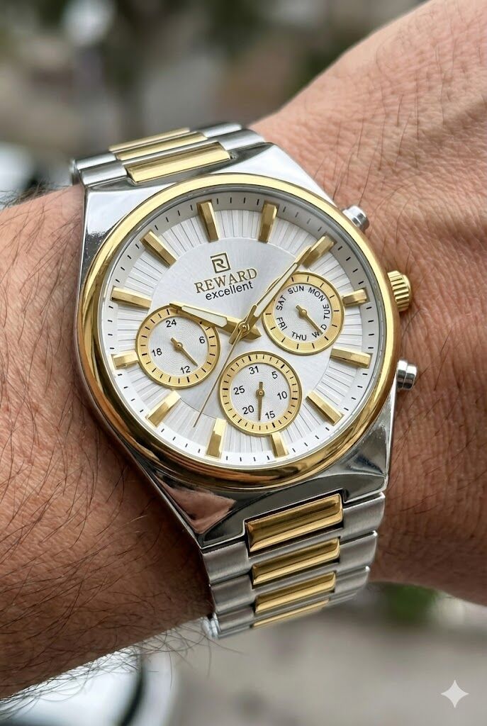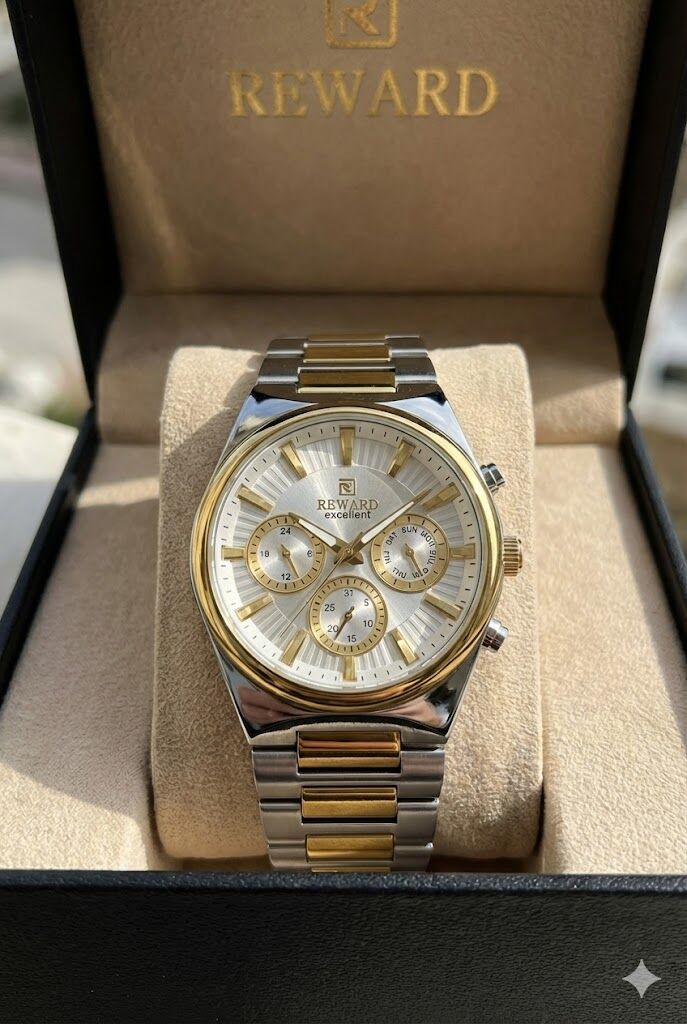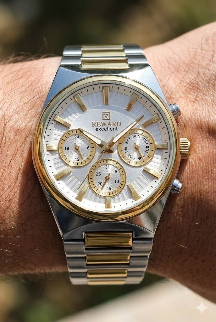 Reward erkek kol saati, gümüş kadranı ve altın detaylı çok göstergeli yapısıyla modern ve güçlü bir görünüm sunar. Çift renk çelik kasa-kordon yapısı sayesinde hem klasik hem de sportif kombinlerle uyum sağlar.