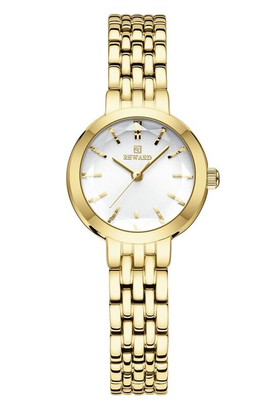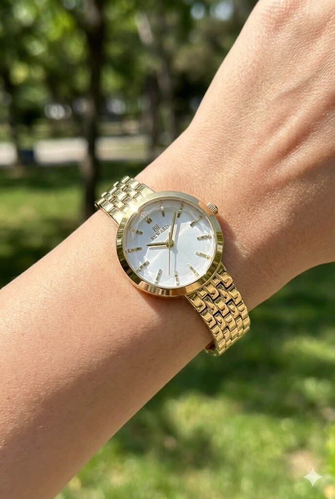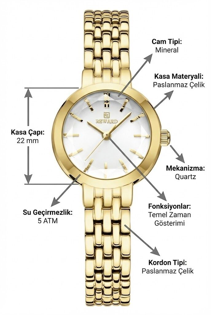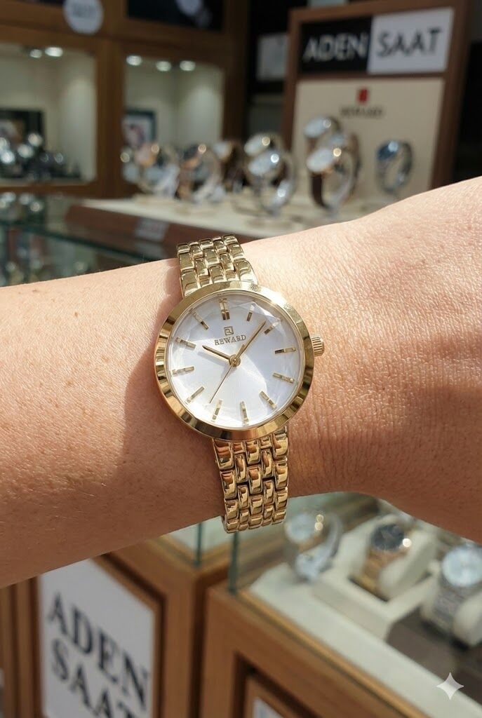 Reward kadın kol saati, zarif kasa yapısı ve ince çelik kordonu ile sade ve şık bir görünüm sunar. Gümüş tonlu kadranı ve minimal indeks tasarımı sayesinde günlük kullanımda ve klasik kombinlerde rahatlıkla tercih edilebilir.