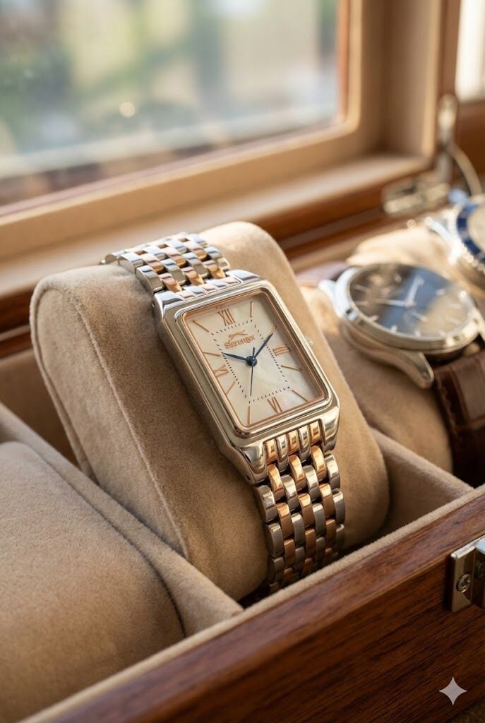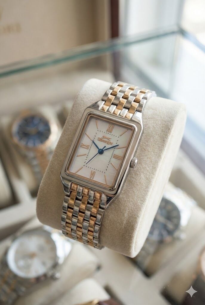 İki renkli çelik kordon tasarımı saate modern bir hava katarken, rose detaylar zarif bir ışıltı kazandırır. Dikdörtgen kasa formu minimal ve sofistike bir görünüm sunar.