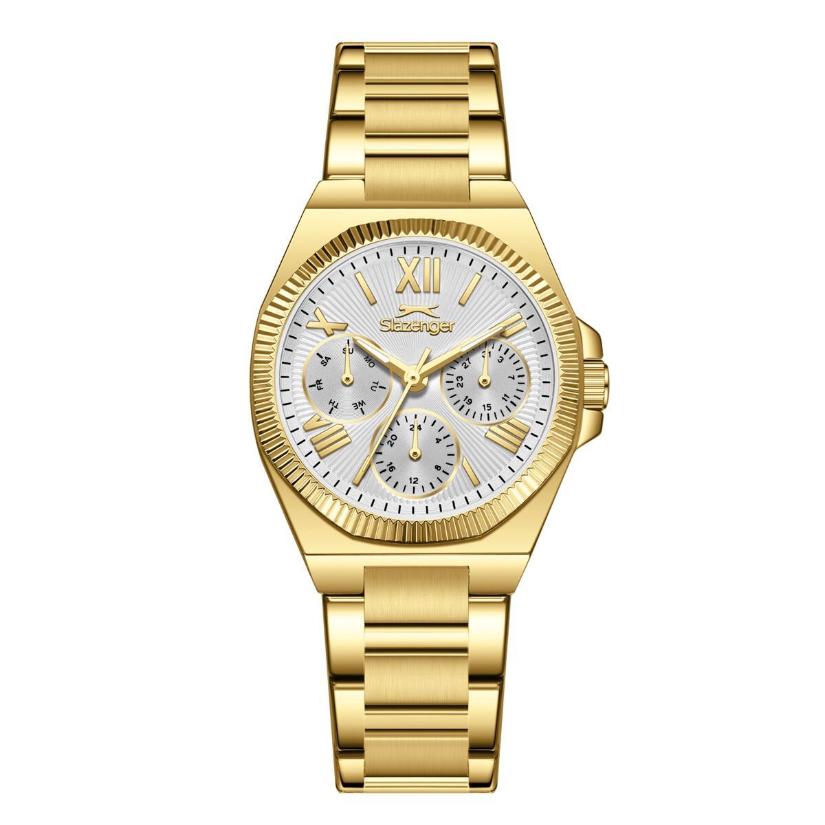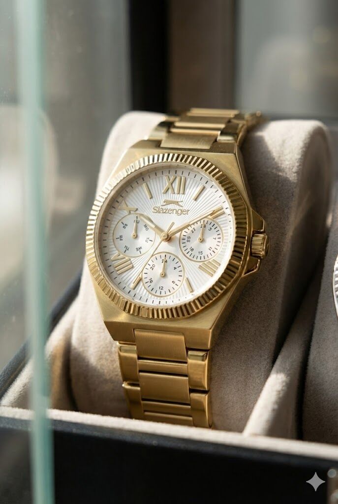 Slazenger SL.09.2537.4.02 kadın kol saati; güçlü gold tasarımı ve çok fonksiyonlu kadran yapısıyla dikkat çeken şık bir modeldir. Modern çizgileri klasik Roma rakam detaylarıyla birleştirerek zarif ve iddialı bir görünüm sunar.