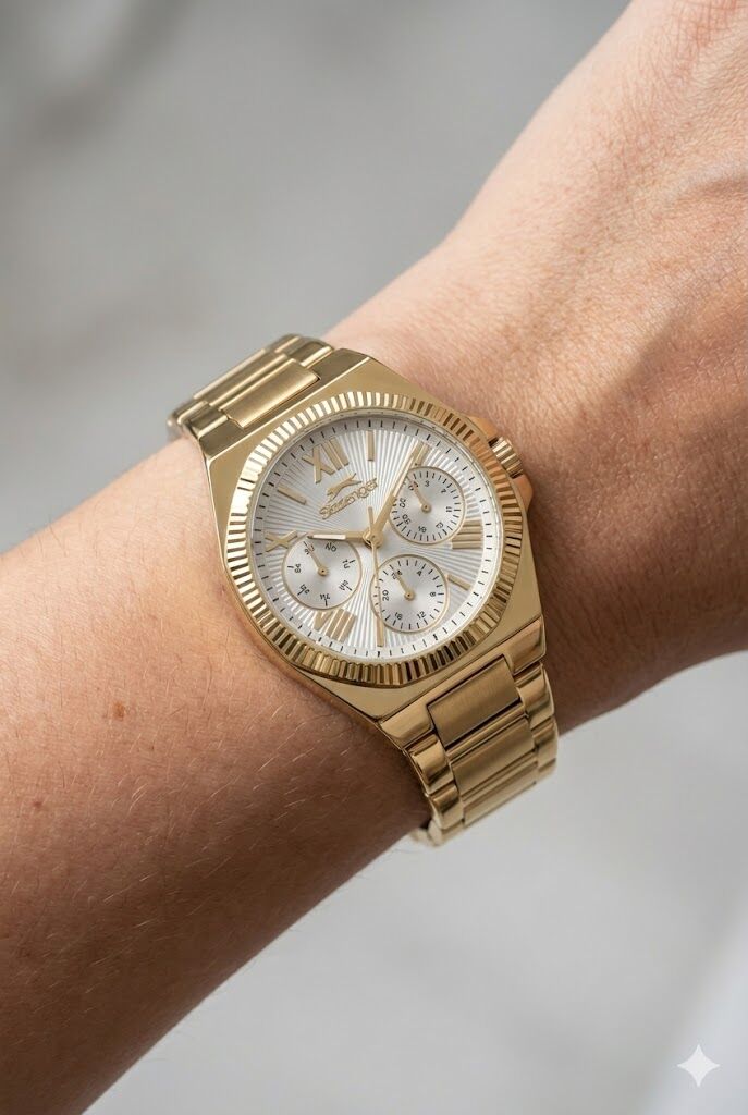 Gold tonun güçlü ve dikkat çekici duruşu, çoklu alt kadran tasarımı ile dinamik bir stil oluşturur. Roma rakam indeksler ve klasik detaylar zamansız bir estetik sunar.