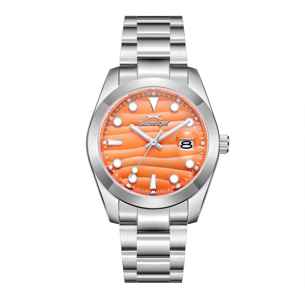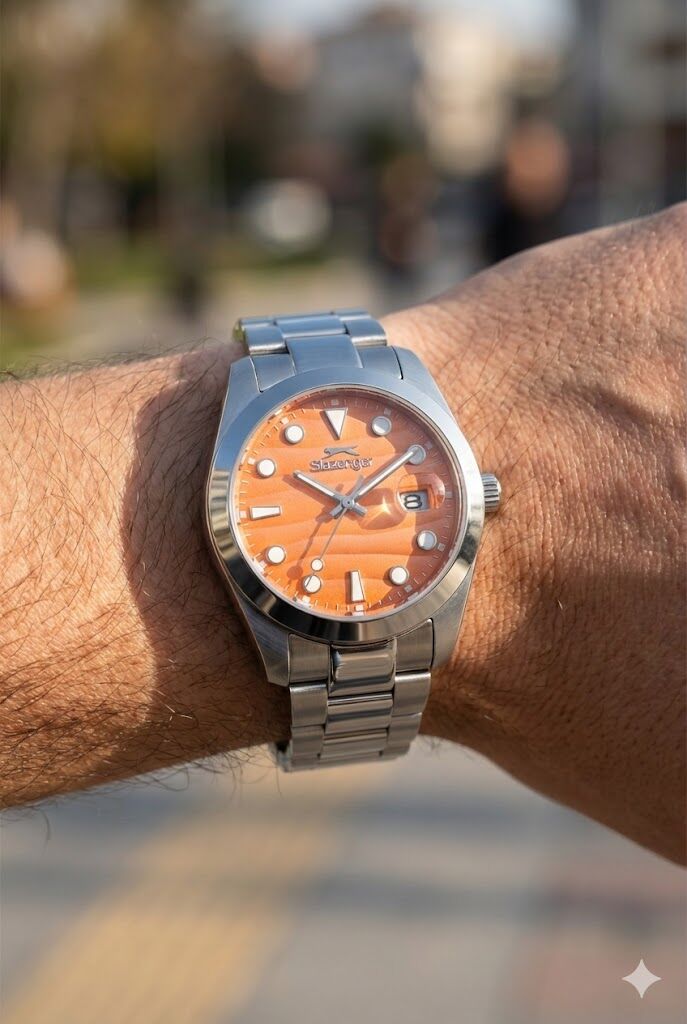 Slazenger 41mm, Rolex Tasarım Erkek Kol Saati | Turuncu Kadran, Gümüş Renk Çelik Kordon, Takvimli Mekanizma,
