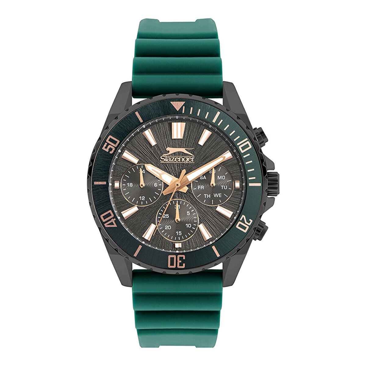 Slazenger 44mm Kurşun Renk Kasa, Yeşil Silikon Kordon, Multifonksiyon Erkek Kol Saati