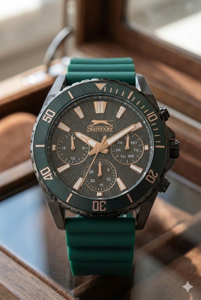 Slazenger Erkek Kol Saati, güçlü kurşun tonlu kasası ve enerjik yeşil silikon kordonu ile sportif şıklığı bir araya getirir. 44 mm geniş kasa çapı ile bilekte iddialı bir duruş sergilerken, multifonksiyon özelliği sayesinde hem stil hem fonksiyon sunar.