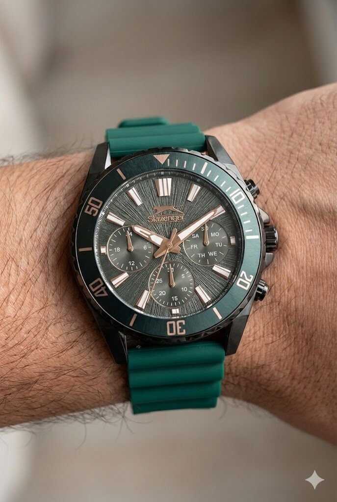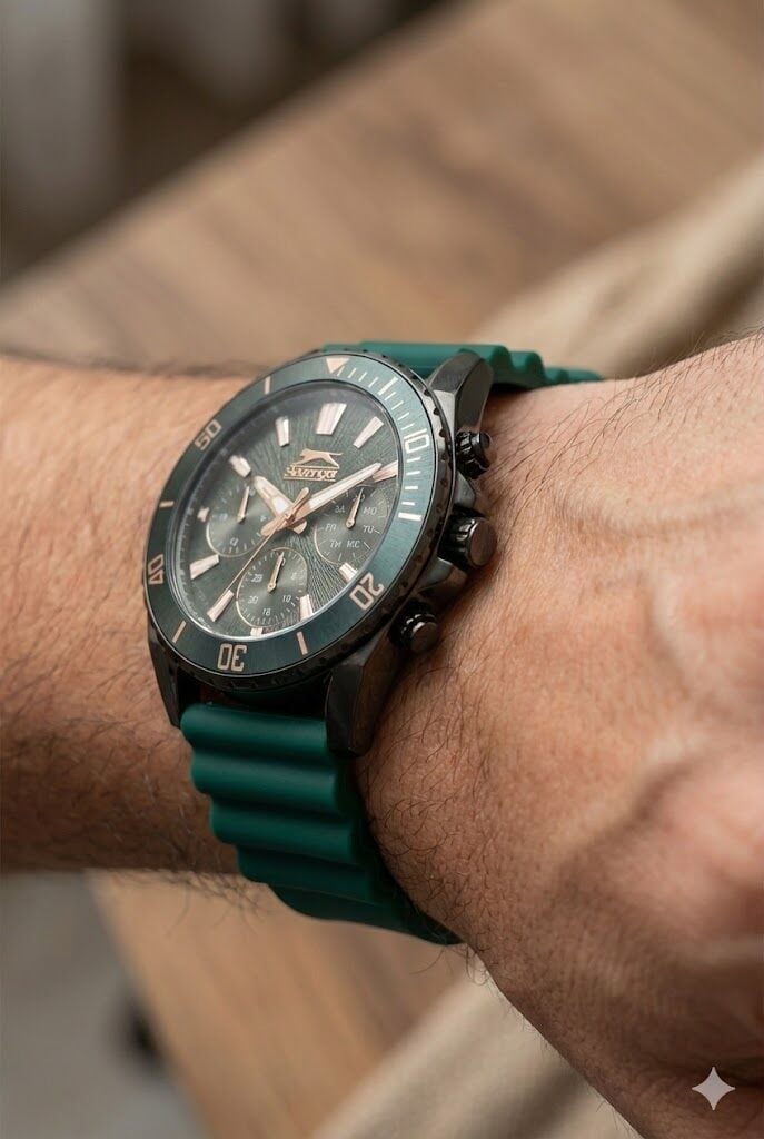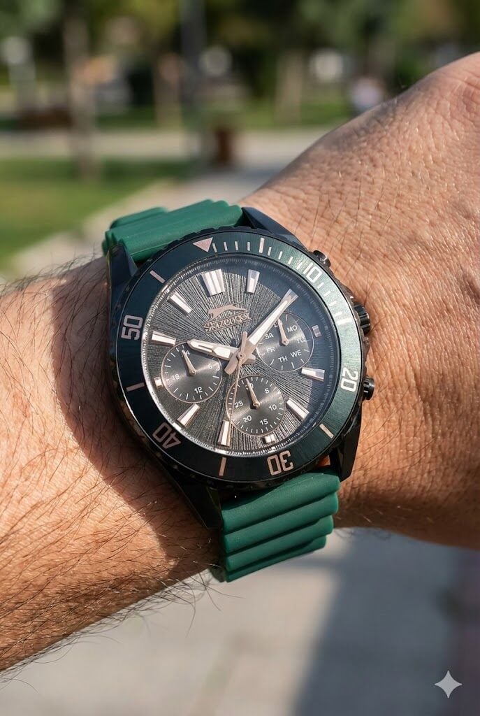 Çok katmanlı kadran yapısı ve alt göstergeleri ile sportif karakter ön plana çıkar. Kalın indeksler ve belirgin akrep-yelkovan tasarımı sayesinde yüksek okunabilirlik sunar. Kurşun kasa ile yeşil silikon kordon kombinasyonu modern ve enerjik bir stil oluşturur.