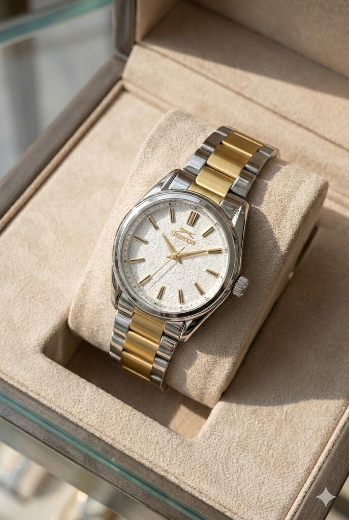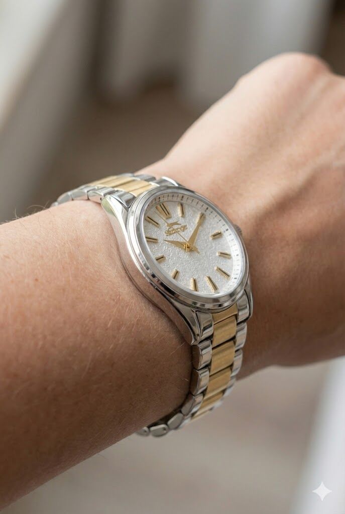 Açık renk dokulu kadran ve gold indeks detayları şık bir kontrast oluşturur. İki renkli çelik kordon tasarımı sayesinde hem günlük hem özel kombinlerde rahatlıkla tercih edilebilir.