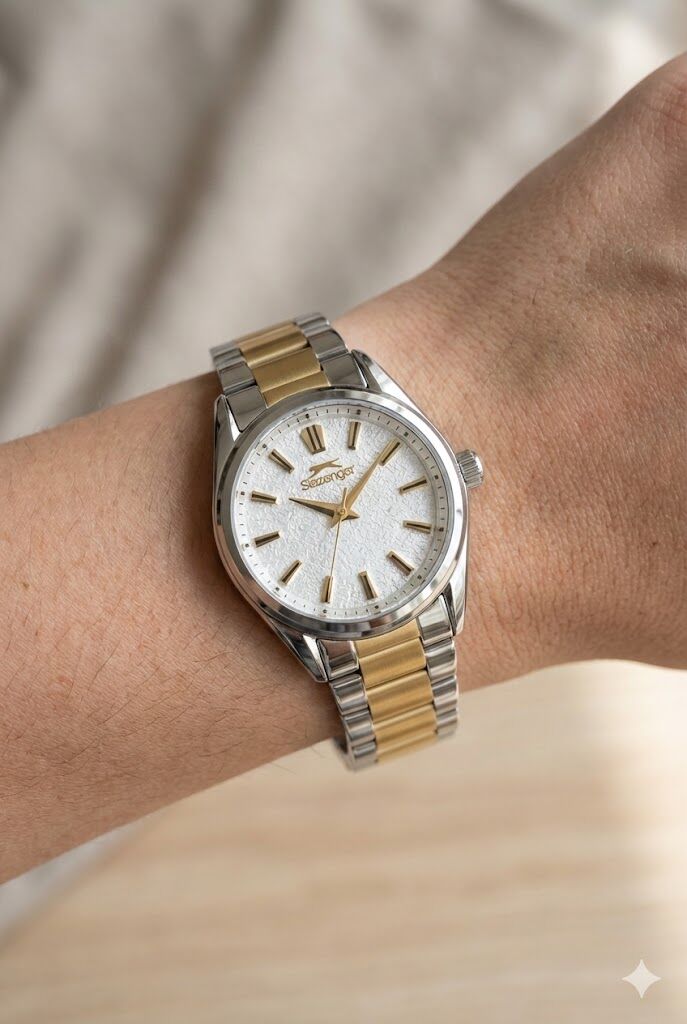 Slazenger SL.09.2533.3.06 kadın kol saati; silver kasa ve gold detaylı çelik kordon tasarımı ile zarif ve modern bir stil sunar. Işıltılı açık renk kadranı ve gold indeksleri sayesinde göz alıcı fakat dengeli bir görünüm oluşturur.