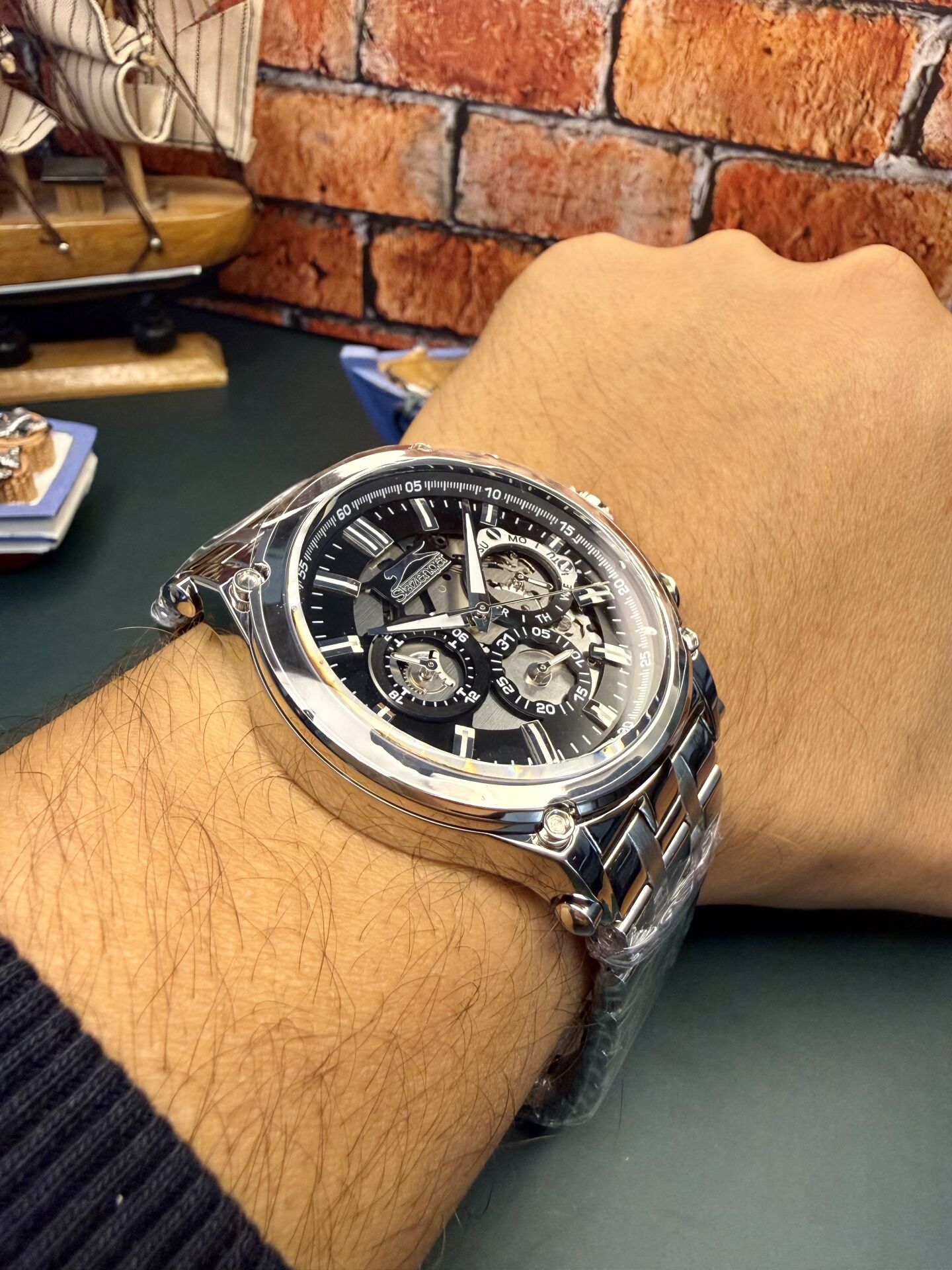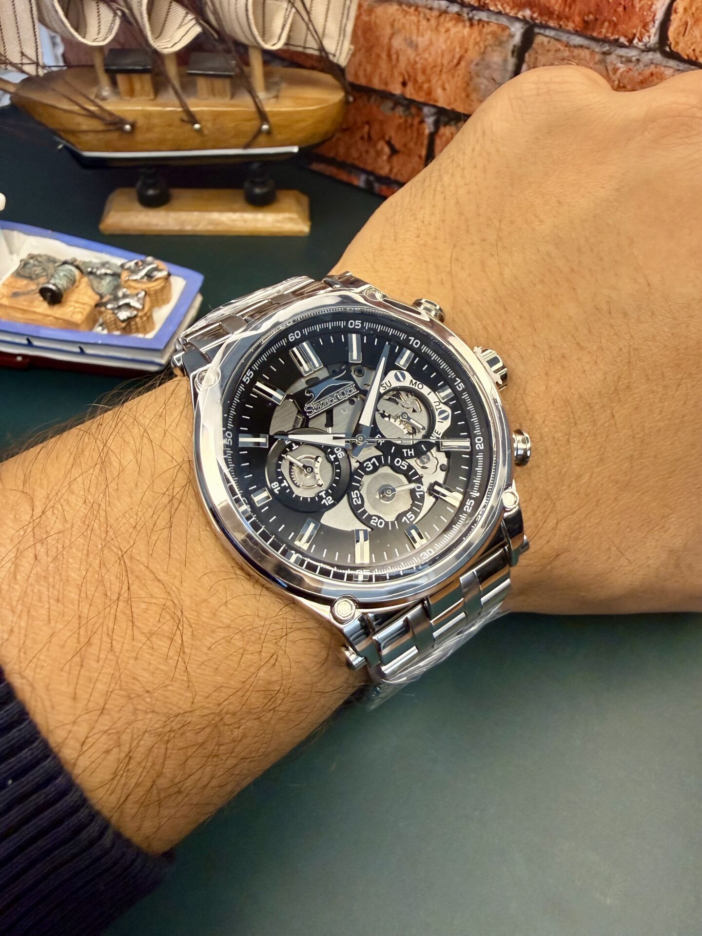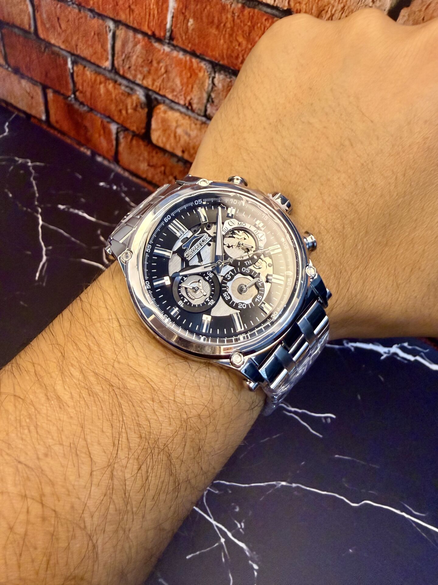 Paslanmaya dayanıklı çelik kasa uzun ömürlü kullanım sağlarken, mineral cam günlük çizilmelere karşı koruma sunar. Kalın ve sağlam kasa yapısı bilekte dolgun bir duruş oluşturur.