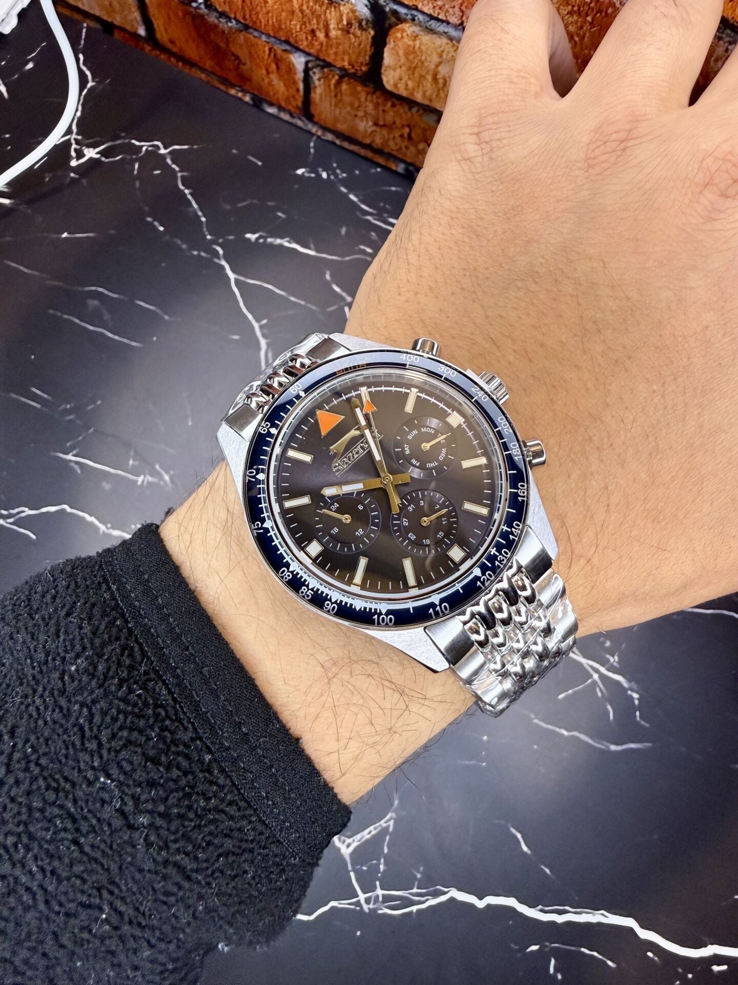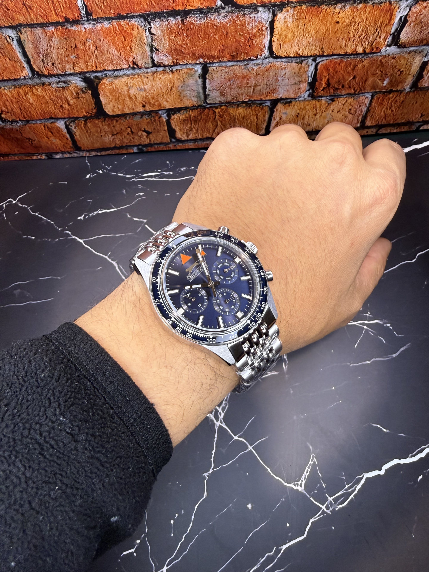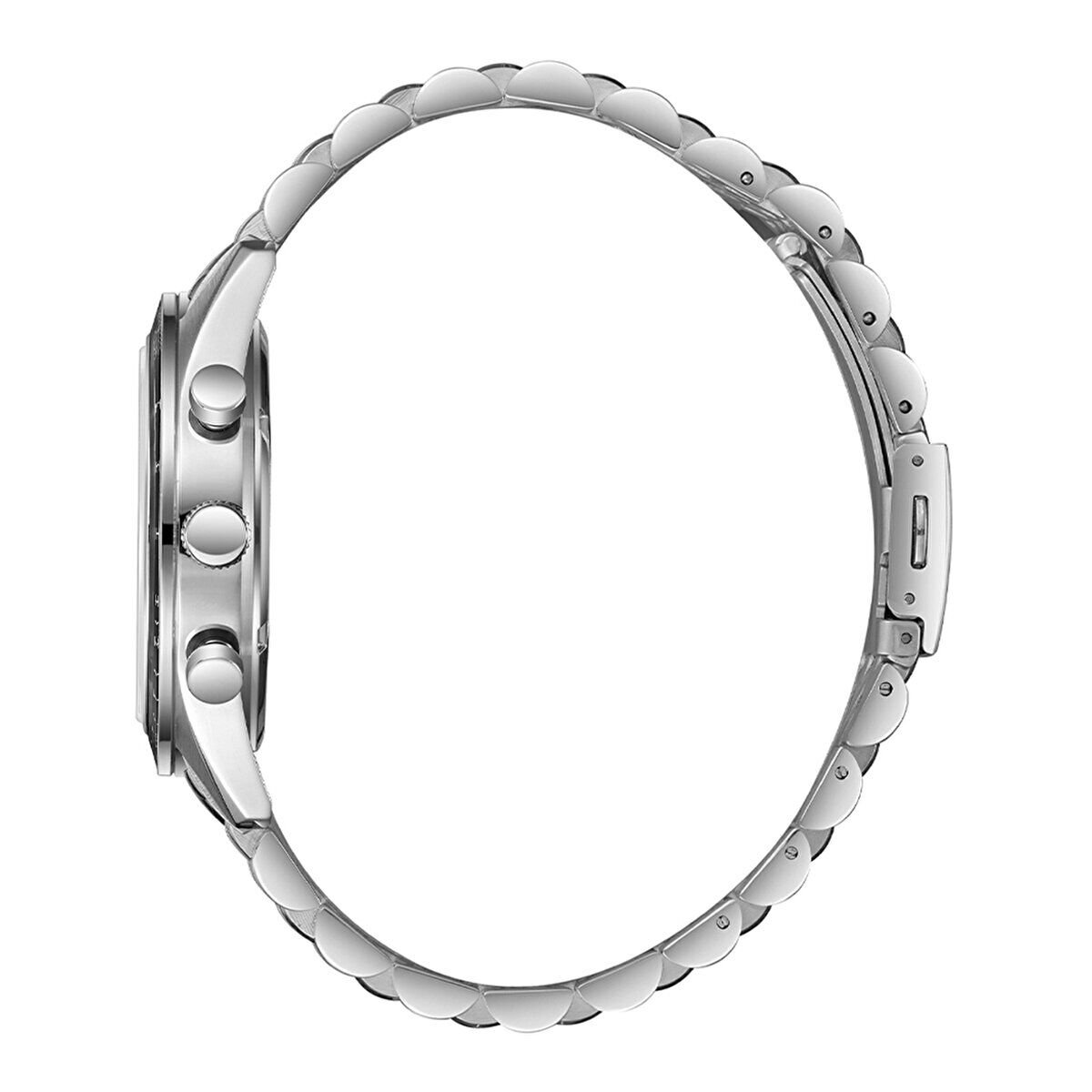 Koyu mavi kadran üzerinde konumlandırılmış alt kadranlar ve kontrast detaylar saate dinamik bir görünüm kazandırır. Sportif bezel tasarımı maskülen bir karakter oluşturur.