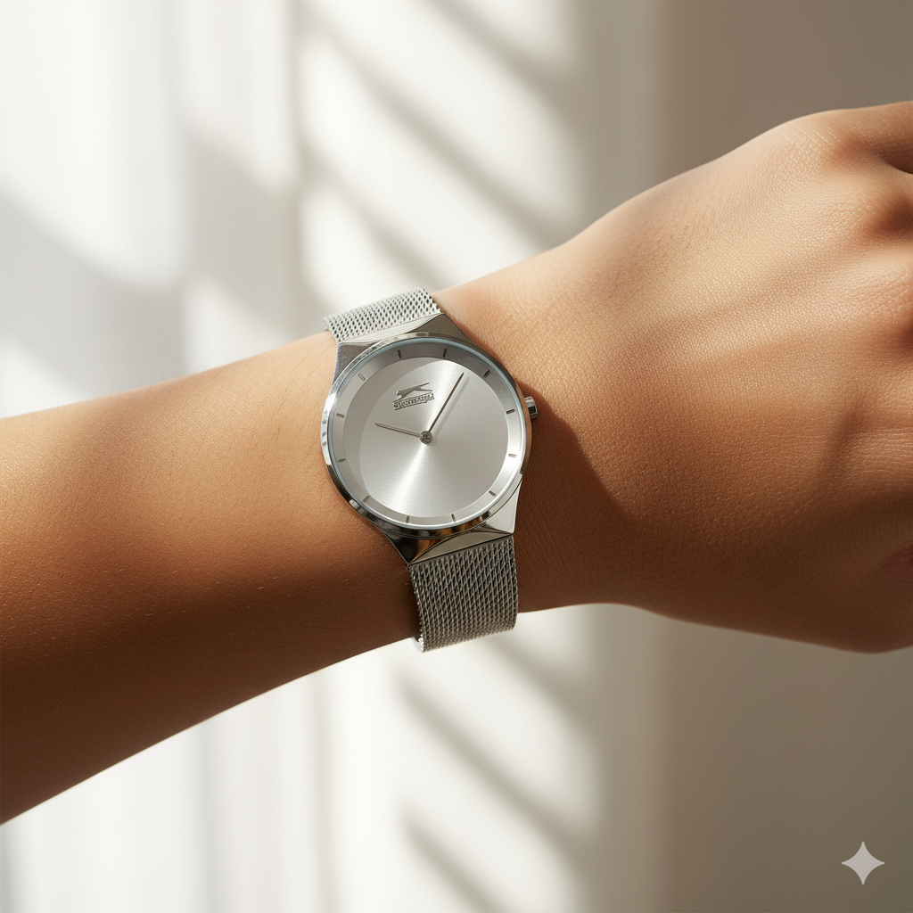 Slazenger kadın kol saati; 34 mm zarif kasa ölçüsü, gri tonlardaki sade kadranı ve modern hasır çelik kordon tasarımıyla minimal şıklığı ön plana çıkarır. İnce ve hafif yapısı sayesinde günlük kullanımda konfor sunarken, sade tasarımıyla her kombine uyum sağlar.