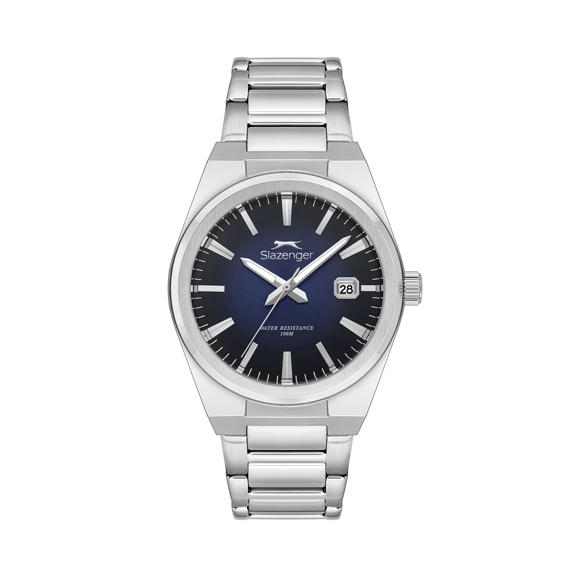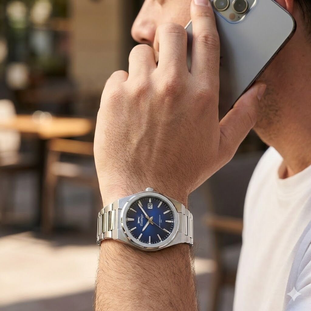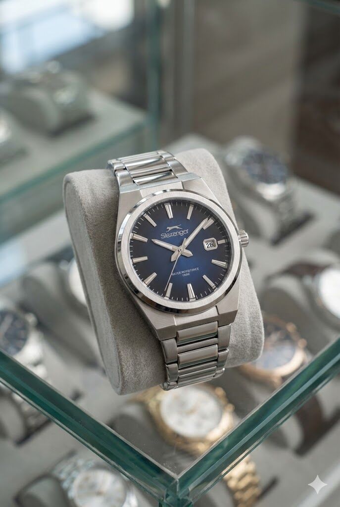 Lacivert degrade kadran tasarımı ışığa göre farklı tonlar yansıtarak saate derinlik katar. Minimal indeks ve tarih göstergesi sayesinde hem şık hem fonksiyonel bir kullanım sunar.