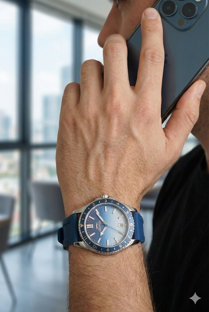 Gradient geçişli mavi kadran ve rose gold tonlu indeksler şık bir kontrast oluşturur. Spor bezel yapısı ve belirgin saat göstergeleri sayesinde yüksek okunabilirlik sağlar. 6 yönünde konumlandırılmış takvim penceresi tasarıma fonksiyonel katkı sunar.