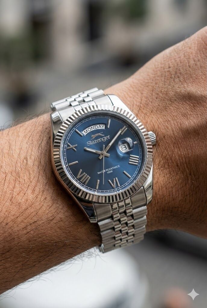 Slazenger erkek kol saati, lacivert kadranı ve prestijli Day Date tasarımı ile güçlü ve zamansız bir stil sunar. 41 mm kasa çapı, bilekte dengeli ve şık bir duruş sağlayarak hem günlük kullanım hem de klasik kombinler için ideal bir tercihtir.