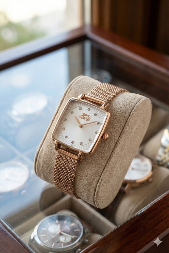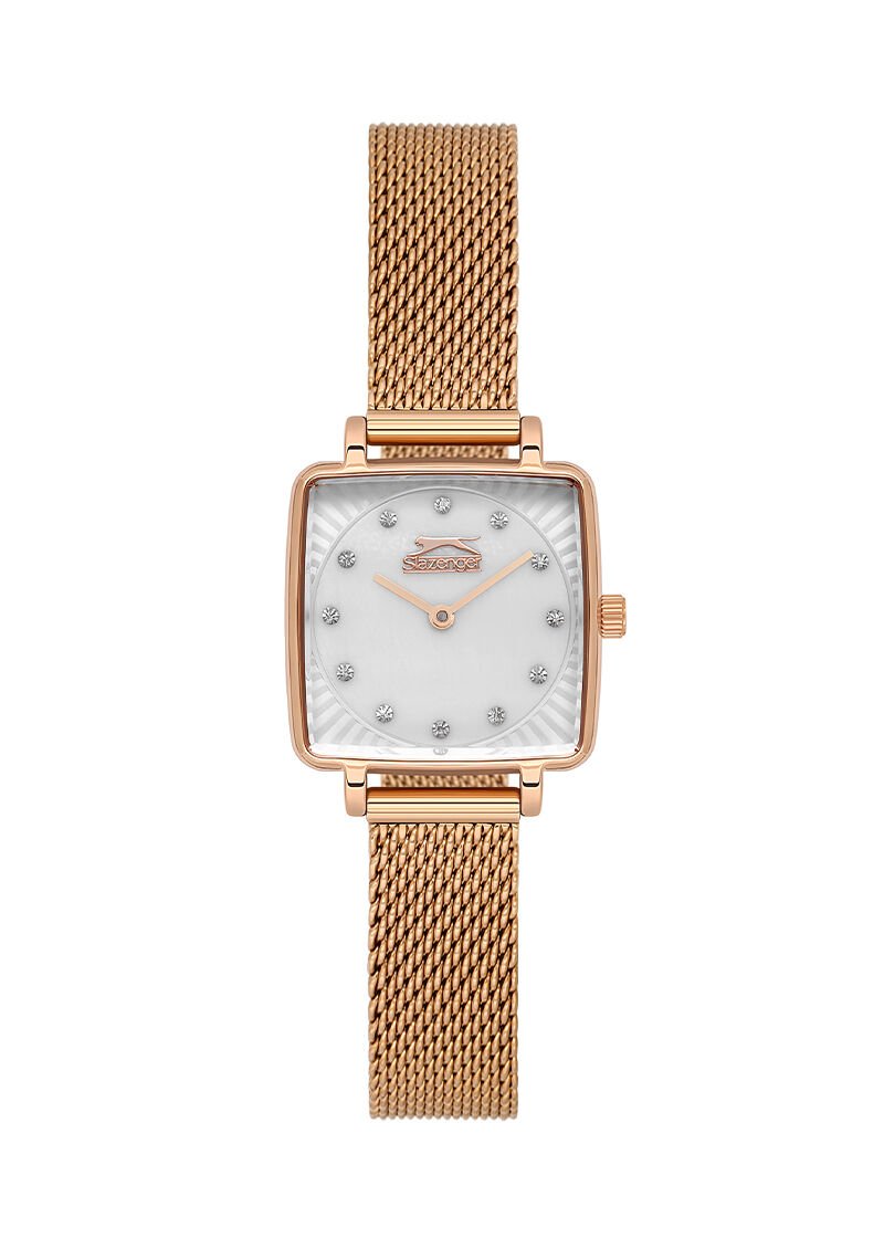 Slazenger SL.09.2255.3.03 kadın kol saati; zarif kare kasa tasarımı, inci sedef kadranı ve rose gold tonlu örgü çelik kordonu ile modern şıklığı ön plana çıkarır. Minimal detayları ve taşlı indeks yapısı ile feminen ve zarif bir görünüm sunar.