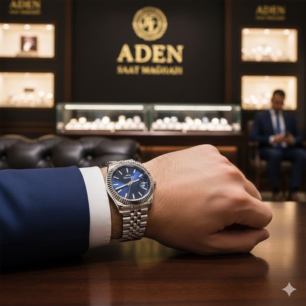 Koyu mavi sunray kadran, ışıkla birlikte farklı tonlara bürünerek saate derinlik kazandırır. Rolex stilini andıran bezel yapısı ve jubilee formundaki çelik kordon modeli premium bir seviyeye taşır. Hem klasik hem spor kombinlerle kusursuz uyum sağlar.