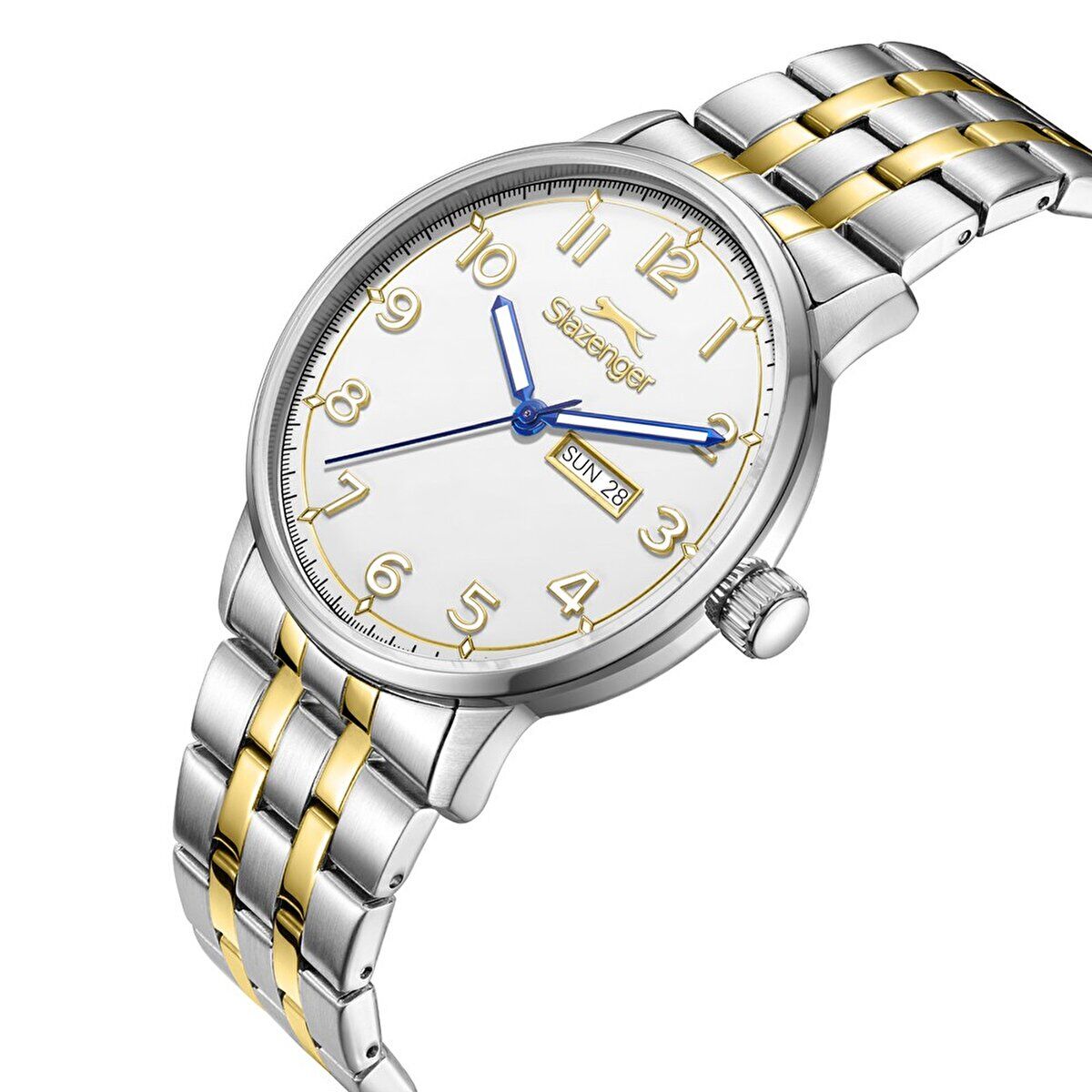 Slazenger SL.09.2560.2.06 Erkek Kol Saati, klasik çizgileri modern detaylarla buluşturan şık bir tasarıma sahiptir. Silver/Gold çift renk çelik kordonu, beyaz kadranı ve mavi akrep-yelkovanı ile göz alıcı bir kontrast sunar. Takvim mekanizması sayesinde hem gün hem tarih bilgisini pratik şekilde görüntüleyebilirsiniz. Günlük kullanım ve iş kombinleri için ideal bir modeldir.
