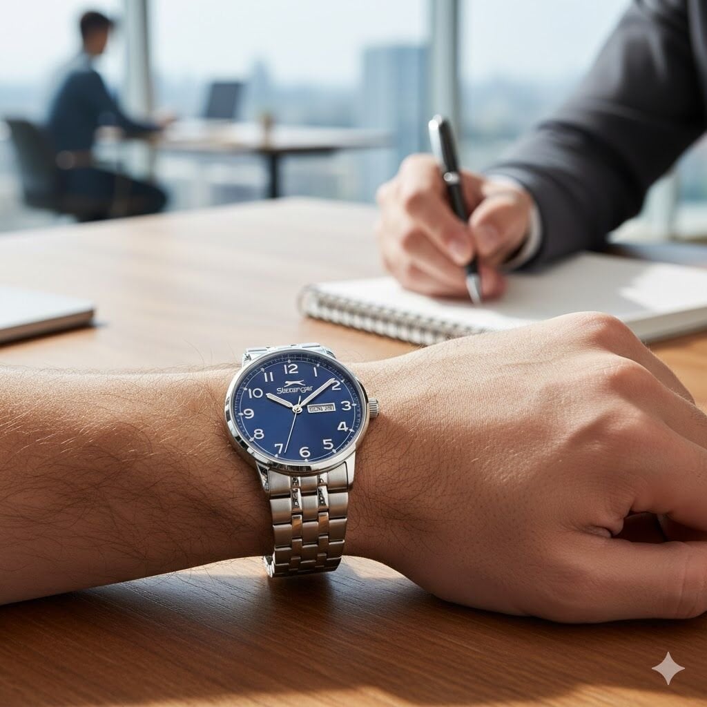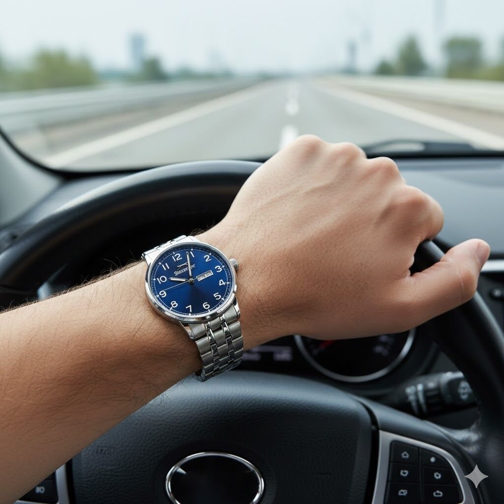 Model, mavi kadran üzerindeki büyük rakam indeksleri ile kolay okunabilirlik sunar. Sağ tarafta yer alan gün ve tarih penceresi ise günlük kullanımda pratiklik sağlar. Çelik bilezik kordon, bilekte şık ve güçlü bir duruş yaratır.